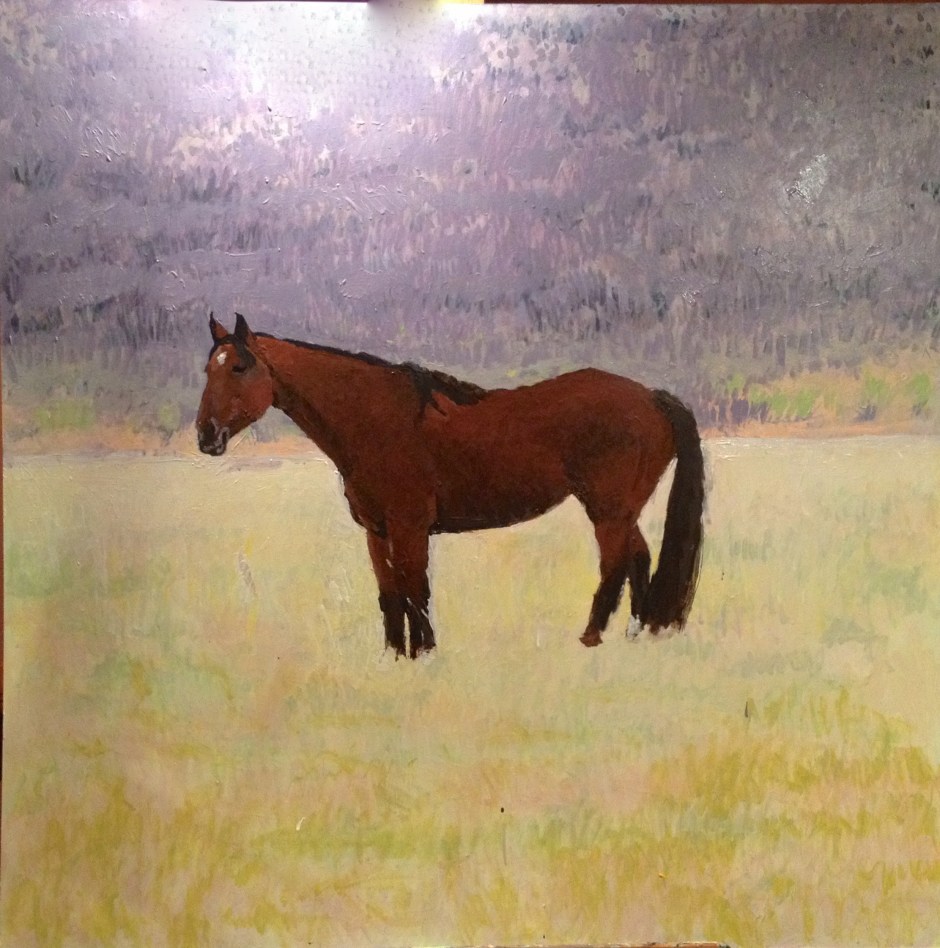 Tiara was retired at 4 years old due to a crooked arthritic leg. This painting inspired me to paint a painting of my horses in each of the 48 states that I will be traveling to this upcoming year. This one is 4′ square but in order to fit enough panels to paint on in my trailer the series will be miniatures, 10″ squares.