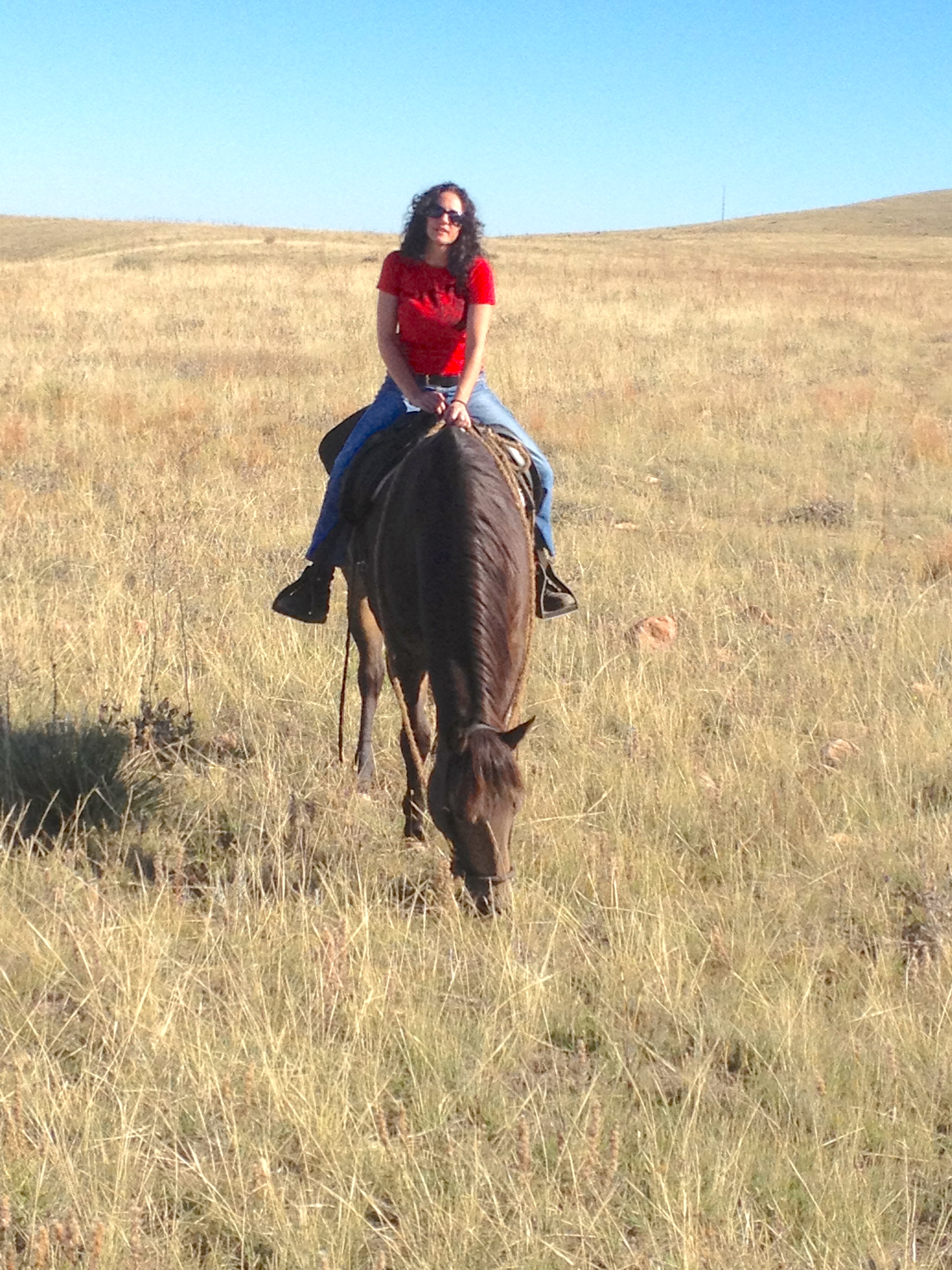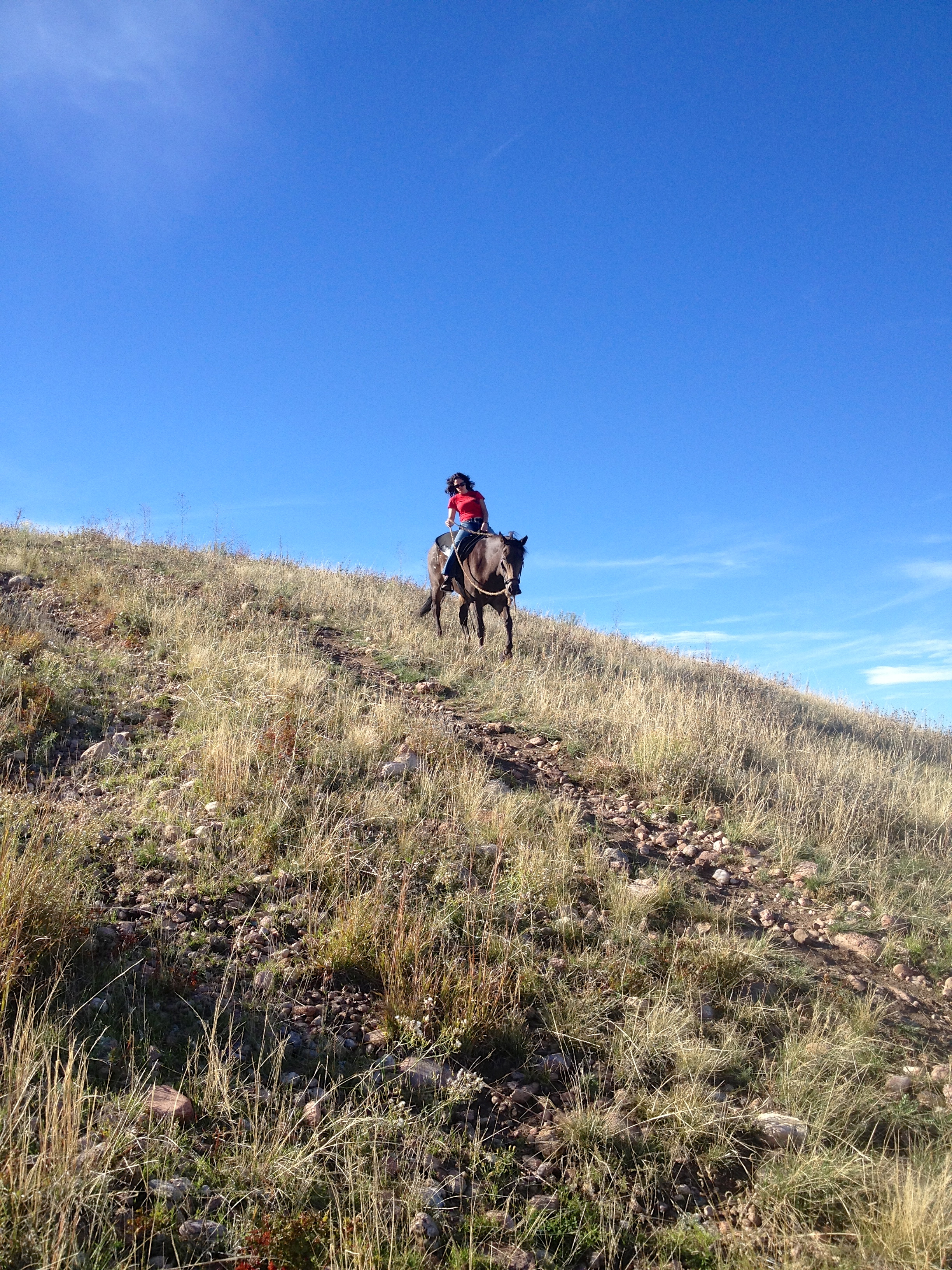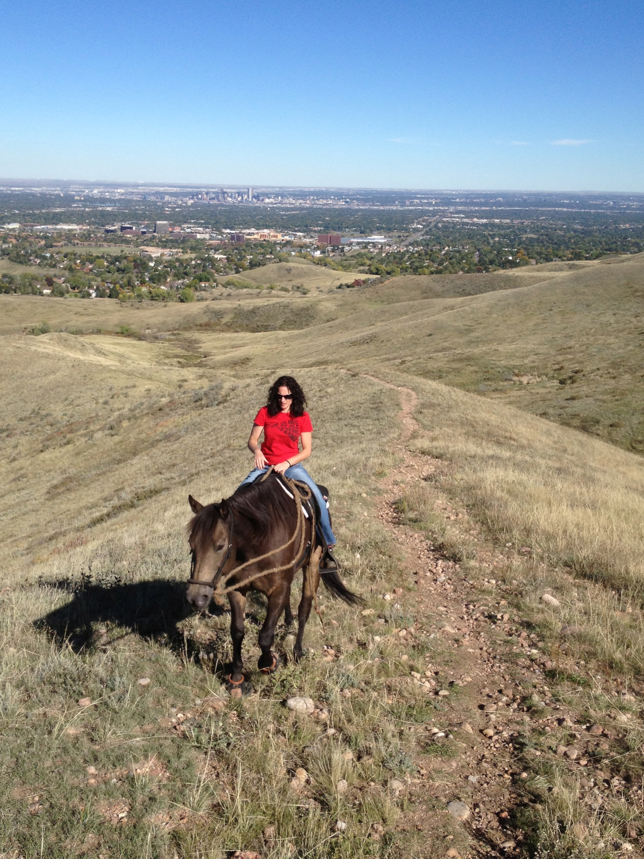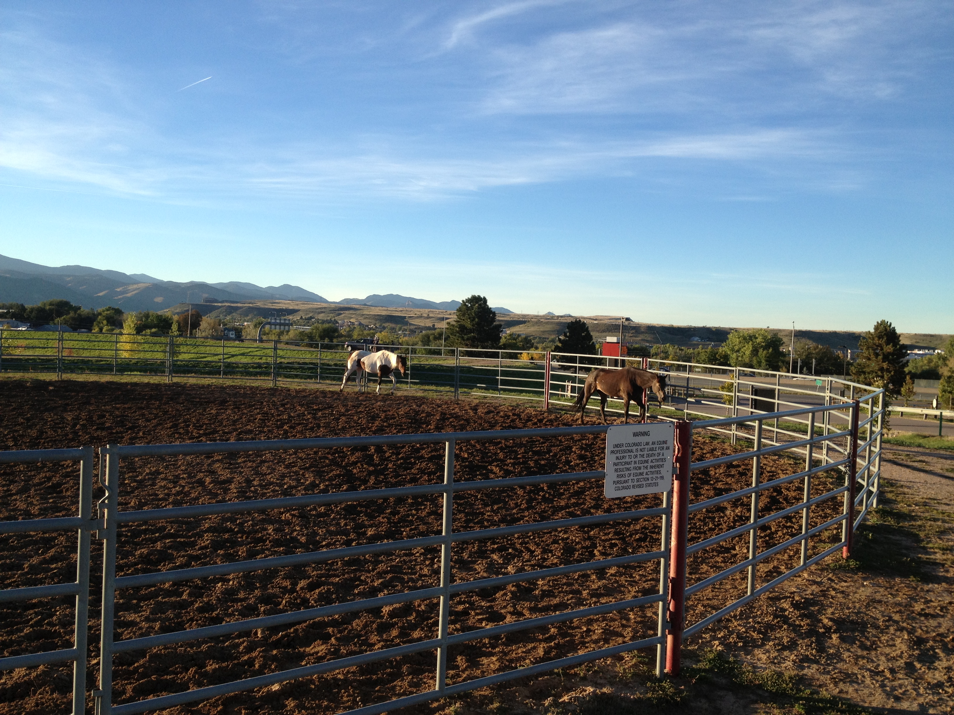 On Monday, Theresa (our nanny in the early 90’s who now lives 20 minutes from here in Eldorado Canyon on a dirt road…very serene place to be) came to the fairgrounds and we made lunch in the trailer and caught up. We then rode up in the hills above here. These are big hills which are the foothills to the Rockies, and covered with grass. Theresa rode Dreamy who took major advantage of her and ate the entire ride. Wildflower was a bit of a pill about it too. They were huffing and puffing between the steep hills and the 6,000’ altitude. I gave them the next day off then rode both of them in the rodeo arena. Funny how 1/2 hour of serious focused ring work fixes them right back up. Must be their excellent foundation training. Thank you Charni and Marci!!
