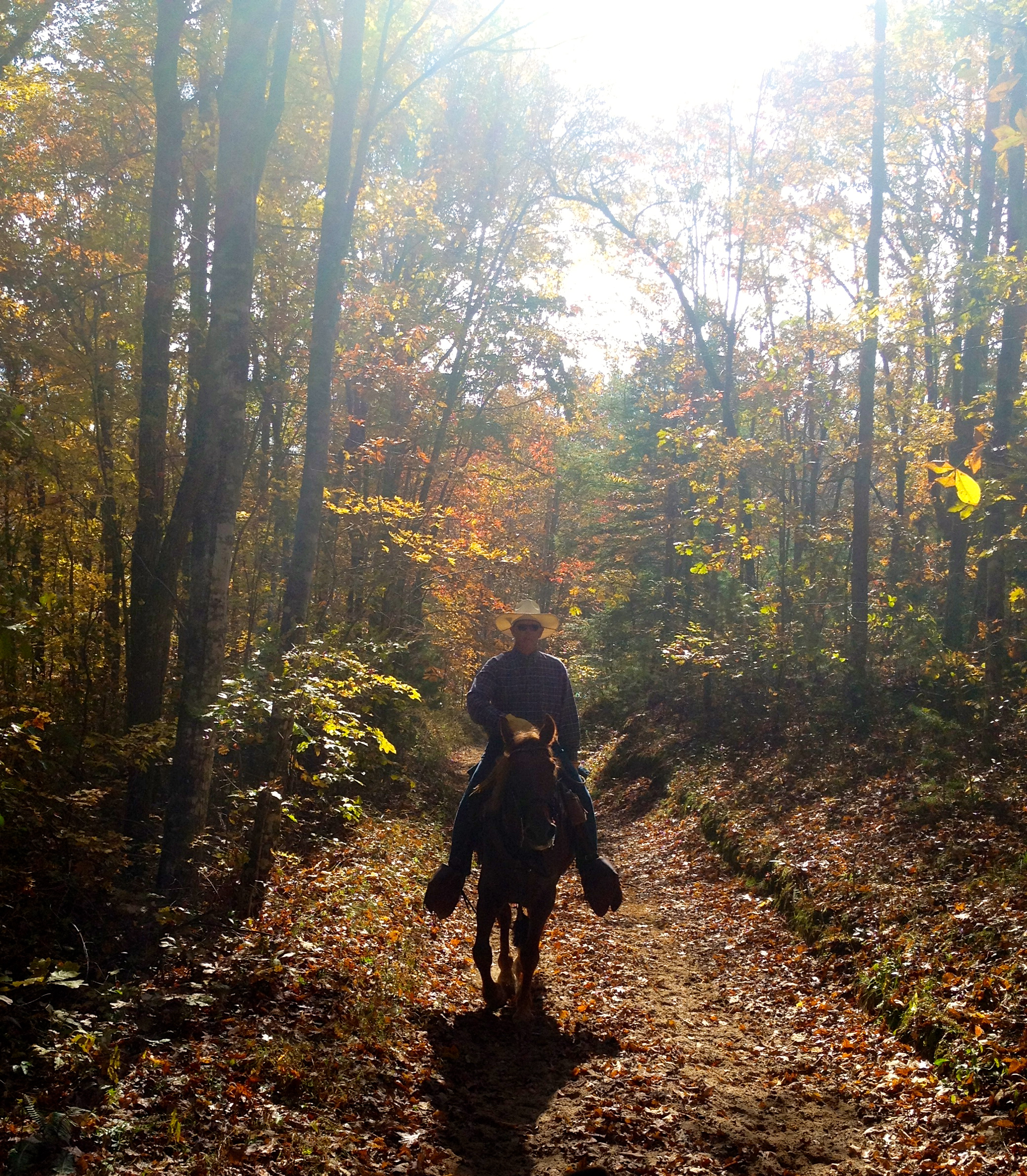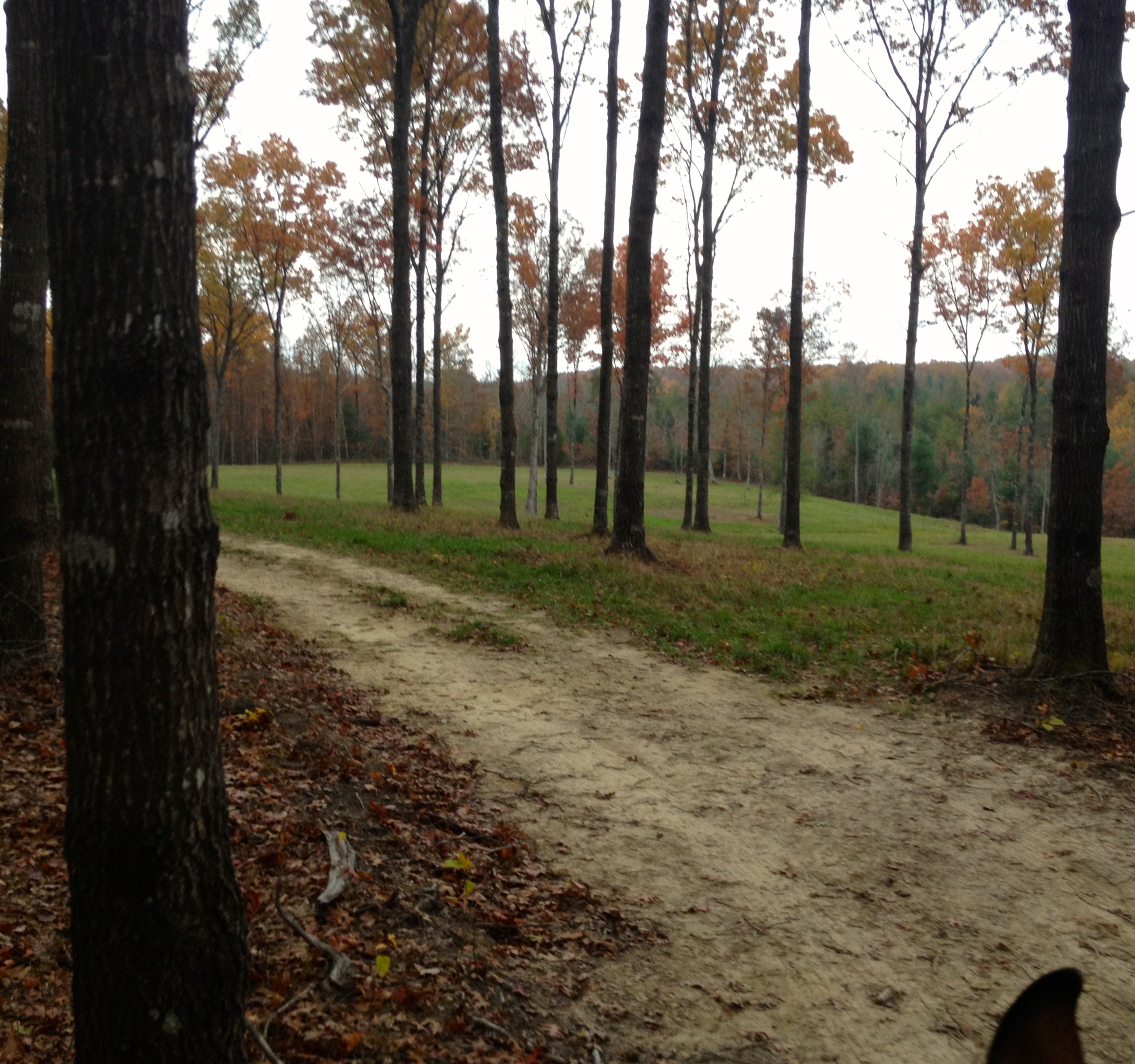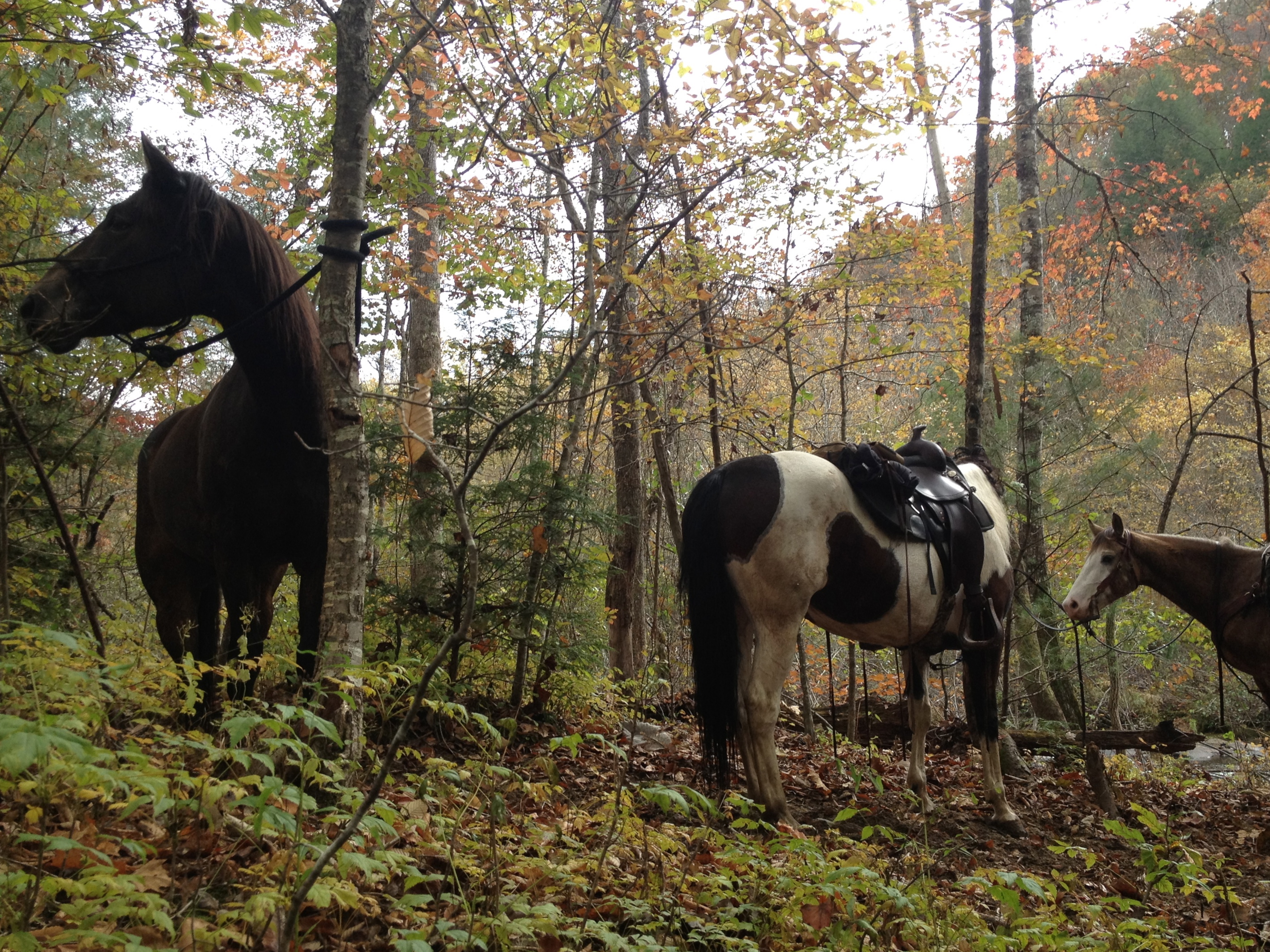 The rain broke in the afternoon and I ponied Dreamy for a quiet peaceful walk. At one point the trail went thru a “subdivision” with dirt roads and pristine paddocks, barns and houses. I REALLY want to live here. We went onto an empty lot of maybe 5 acres, surrounded by tall trees brilliantly colored by Fall now. It was so peaceful. THEN BAMMM…BAMMM…shot gun blasts from the woods we had to go thru to get back to camp. There were 15-25 blasts. Wildflower was quivering with fear. Dreamy was unfazed. There was no way I was going back that way and I didn’t know how else to go that wouldn’t add 5 miles to our stroll. Eventually I got in touch with camp and they sent a stock trailer out for me…this is my #3 rescue with a stock trailer. This was not my fault tho!!! “Muzzle” season began today, I wish someone had warned me. I have never heard such a loud gun blast. They were most likely target shooting since anything they would of been hunting would of been long gone or dead after the first shot. But I really wasn’t up to forcing Wildflower to endure her fear, I have often wondered if she heard the guns used at the Canadian place where she was held as a baby awaiting slaughter before she was rescued and brought to me. I am pretty sure she did now.