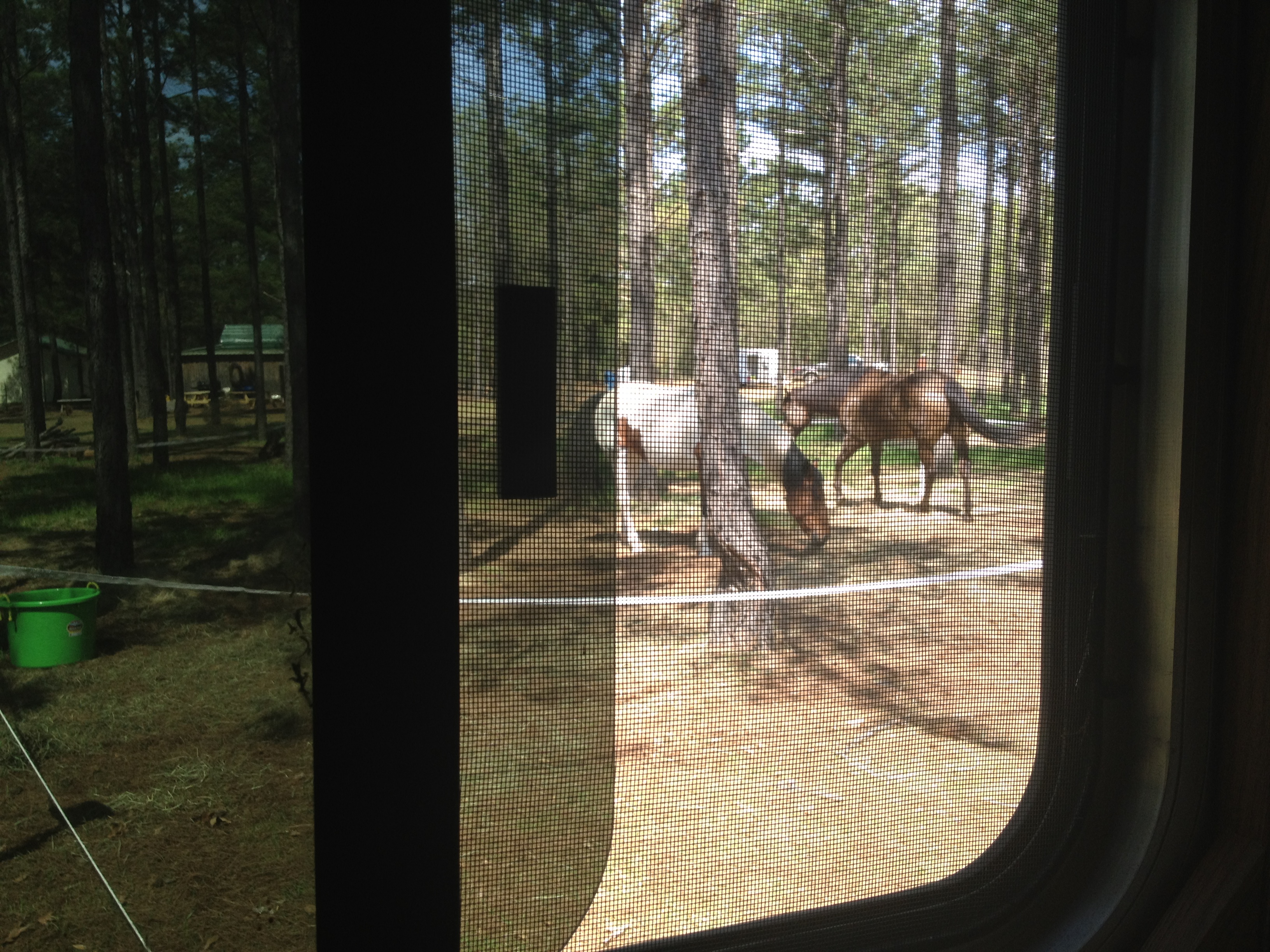 The night I got in I was tired and crabby. I had been hauling for 2 days, about 6 hours each and my lower back was starting to say quit sitting or you’re gonna be sorry. Tommy’s puppy antics were getting on my nerves as I was trying to set up the portable corral. There were swarms of gnats and it was hot. And not a soul here which I found pretty disappointing and a little frightening. But I got my pick of the sites and like my set up.