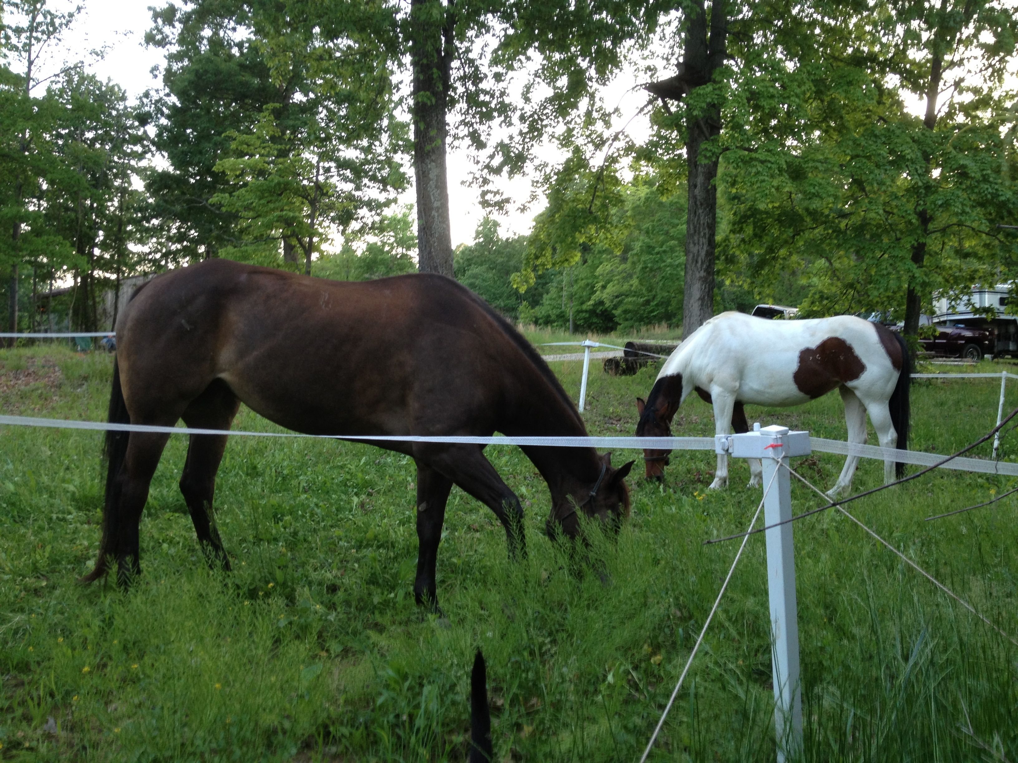 When I went to feed this morning I saw the remains of my Ezee Corral on the ground. They were loose, not far away, still in camp, eating grass. But the corral tape is ripped from the clips and it is trash now. Later the manufacturer called me but too late. And they emailed me back. I emailed them about what happened and that I’d like a refund. I tied the girls to the hitching rail with hay nets and water and went to Tractor Supply to buy a better system. Norm had said to me “you don’t like to tie your horses up much?” and later “its the bar of patience” (I think that’s what he said). So I decided to tie them up more, he is right. I was gone about 3-4 hours and they were quite relaxed when I returned. I had also found a GMC dealer to due the maintenance service that the truck needed so it took a while. Then I set up the new corral and put them in it. I touched it to test it and wow, it is a much stronger jolt than the old one.