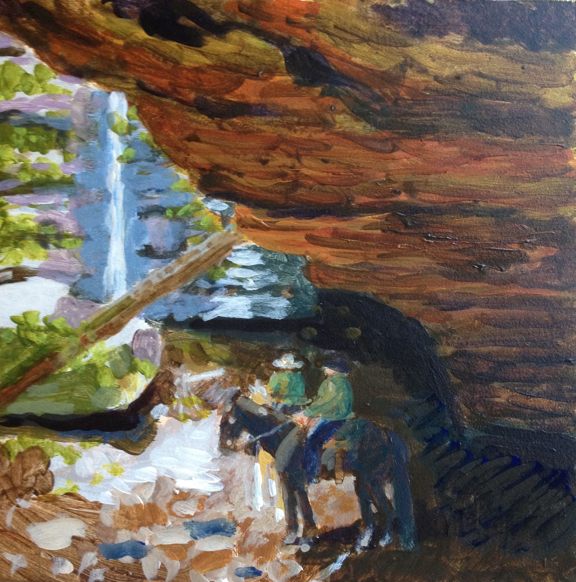 I chose to do the Illinois painting of a shot I took of the couple I rode with under a cave overhang next to a waterfall. I knew it was a good shot when I took it on our Rice Hollow ride, but the photo was awful, highlights were totally blown out and shadows were black. Luckily I had a series of shots from there and was able to figure out what it looked like. It is completely different than the others state paintings, there is NO sky whatsoever and NO grass. But I enjoyed doing it and am satisfied with it.