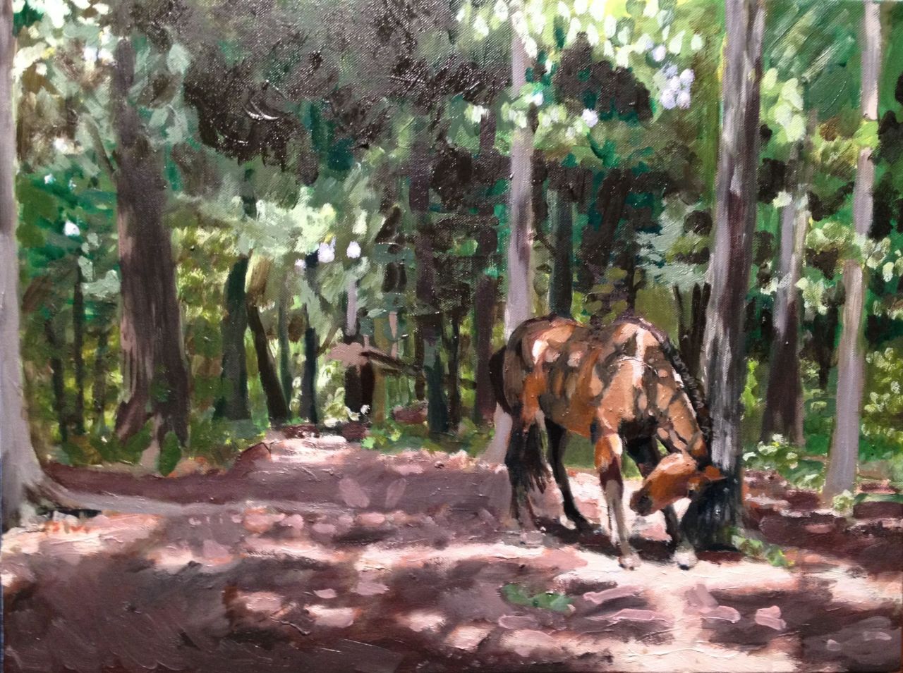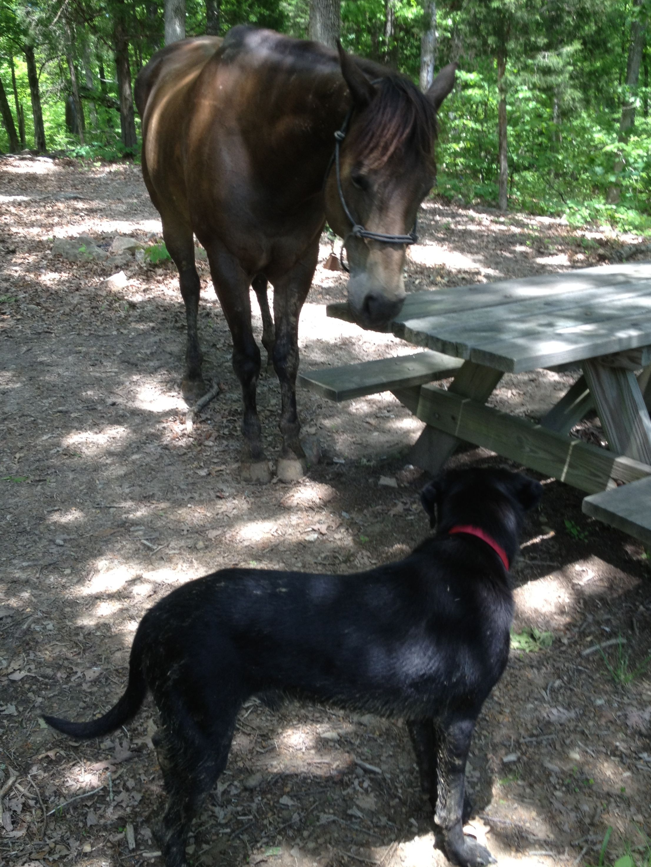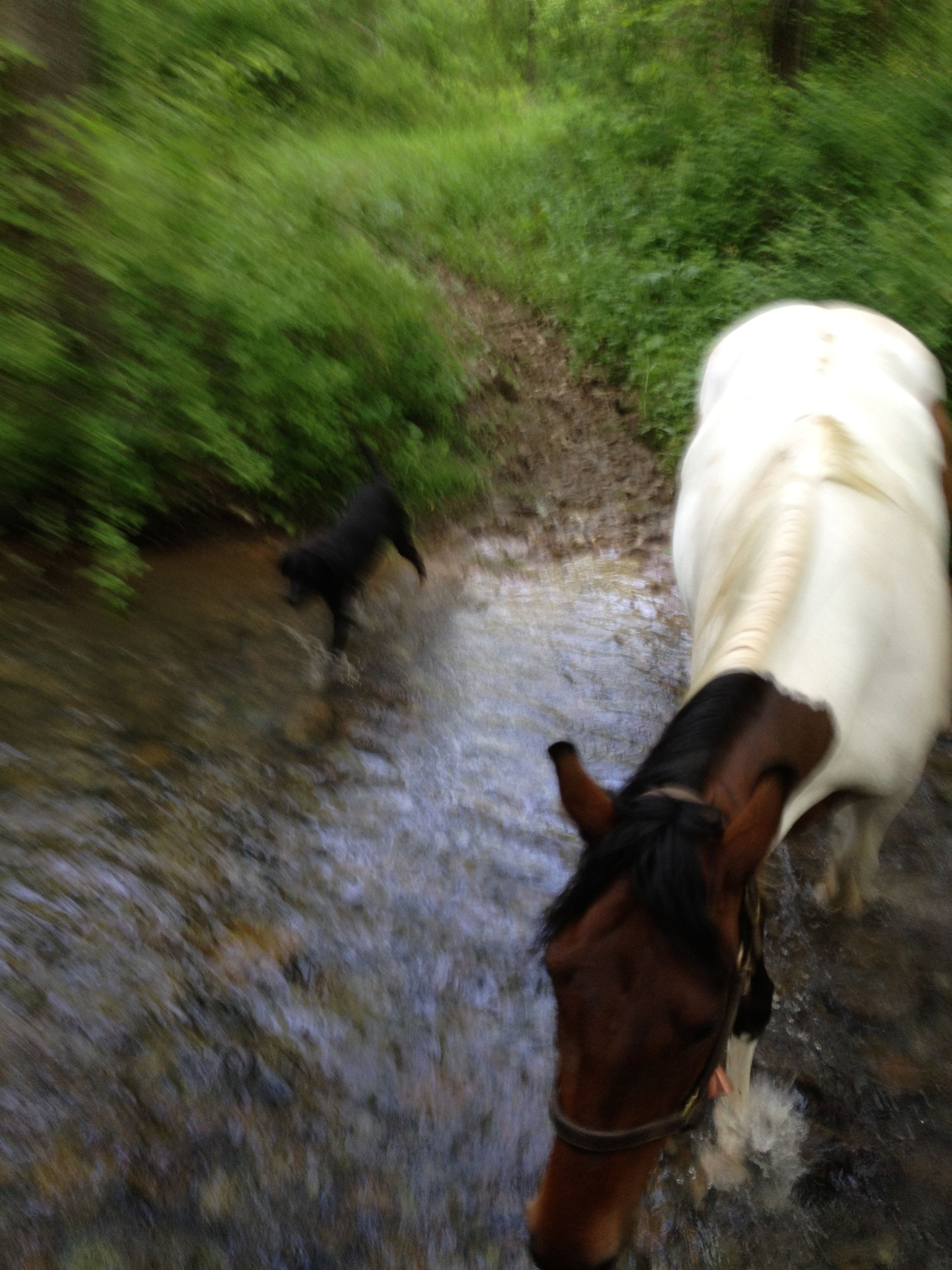I painted and checked on them every once in a while. The super nice camp owner said this was ok and asked if they could eat all the tall grass areas so he doesn’t have to hog brush or bush hog or something like that. I think it means mow the tall grass? He asked me what I thought about his camp. I immediately thought of the comments those guys had made about not enough trails. I think this camp is really nice. Its very pretty in camp with a lot of shade trees everywhere. He is building a shower house and I asked him why. He thought that he looses campers to the state park camp because they have a shower house. I told him I’d rather have a dump station than a shower house. I am not here just for the trails and it seems I have a completely different idea of what is enough trails than most do. I don’t mind riding a trail twice in a visit. You always see something new, and I like getting to know it. I just love being out in the woods (or whatever is there) on my horse, and now with my dog too. Its not about seeing something grand or special or doing a gazillion miles. And its about the people I meet at camp too. Horse people are different and I love meeting new ones. And I like the small intimate feeling I have here.