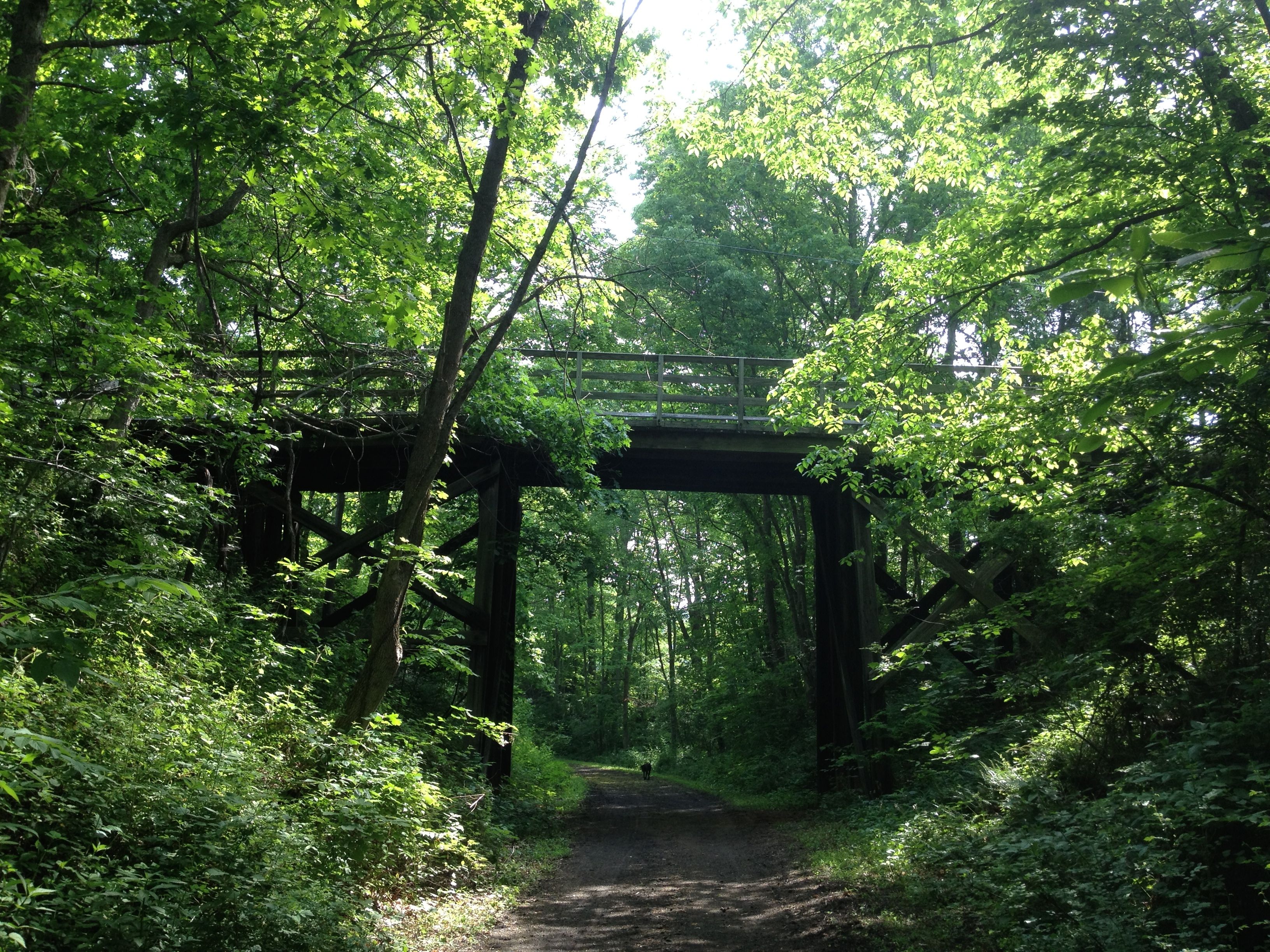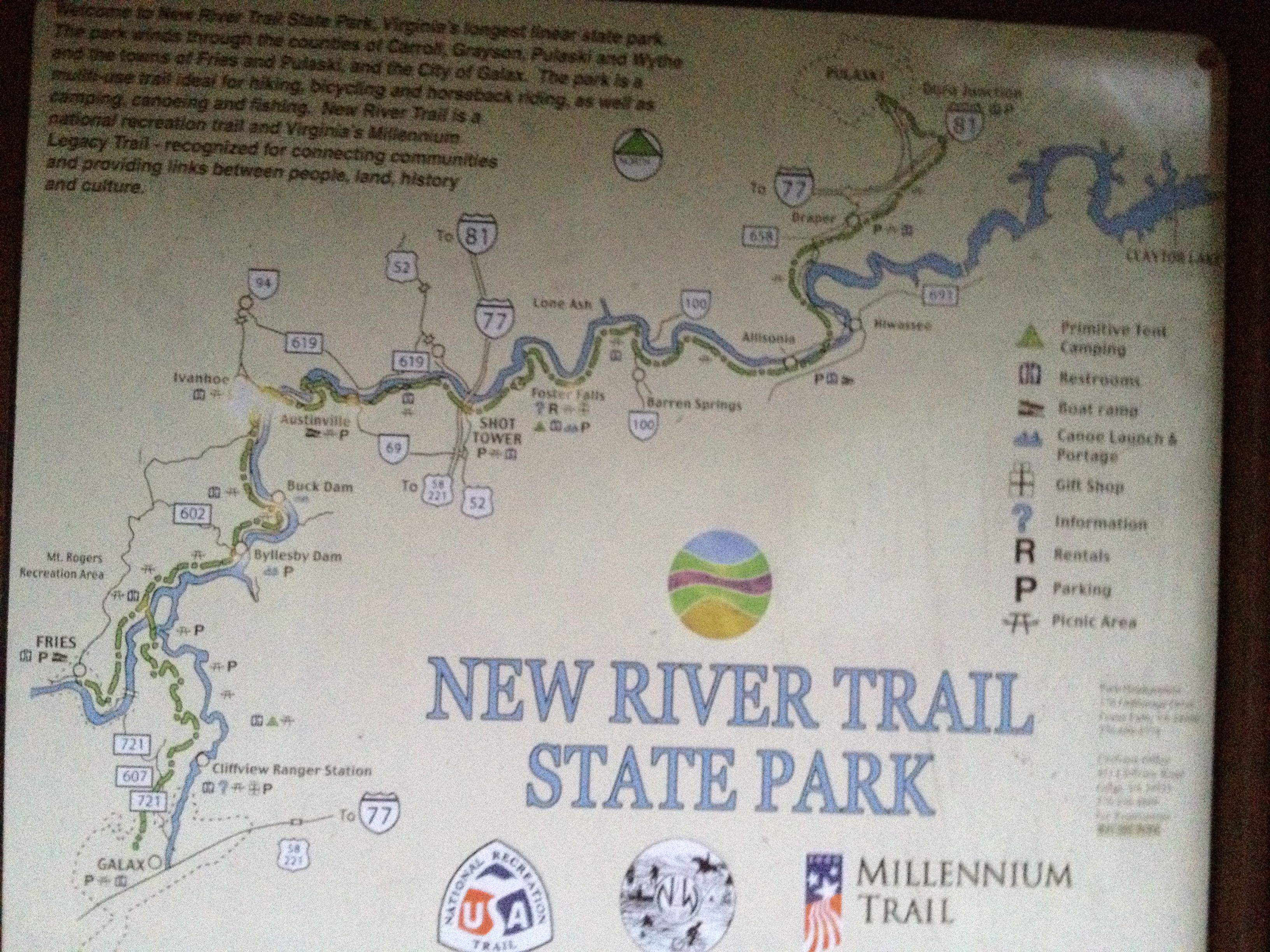 So at dinner there were at least 12 people, some of them relatives, some friends, some campers. I had a great time and Penny had rhubarb pie which I have only had once before, back in college when my art prof took us to his farm to paint for the day and his wife had made it. It was delicious! I met 2 other women campers on my way back to get Tommy for a walk. We went up to the trestle that we went under to get here, its super tall. I took some pictures of the signage at the trailhead parking area to find out about the area, something about the longest trail in the state.