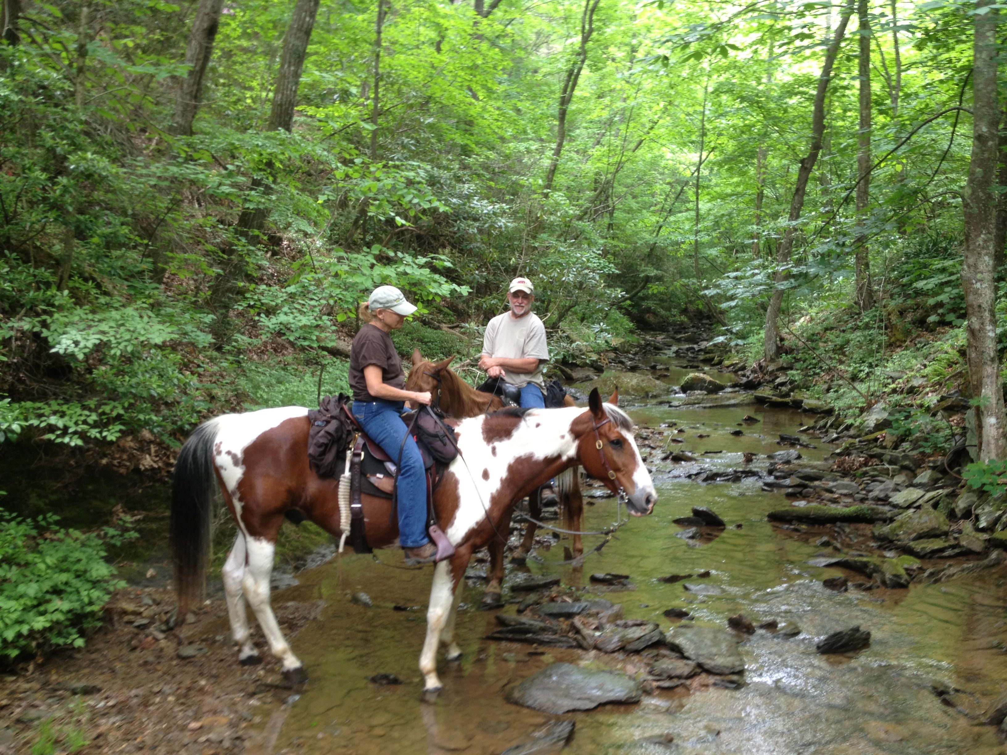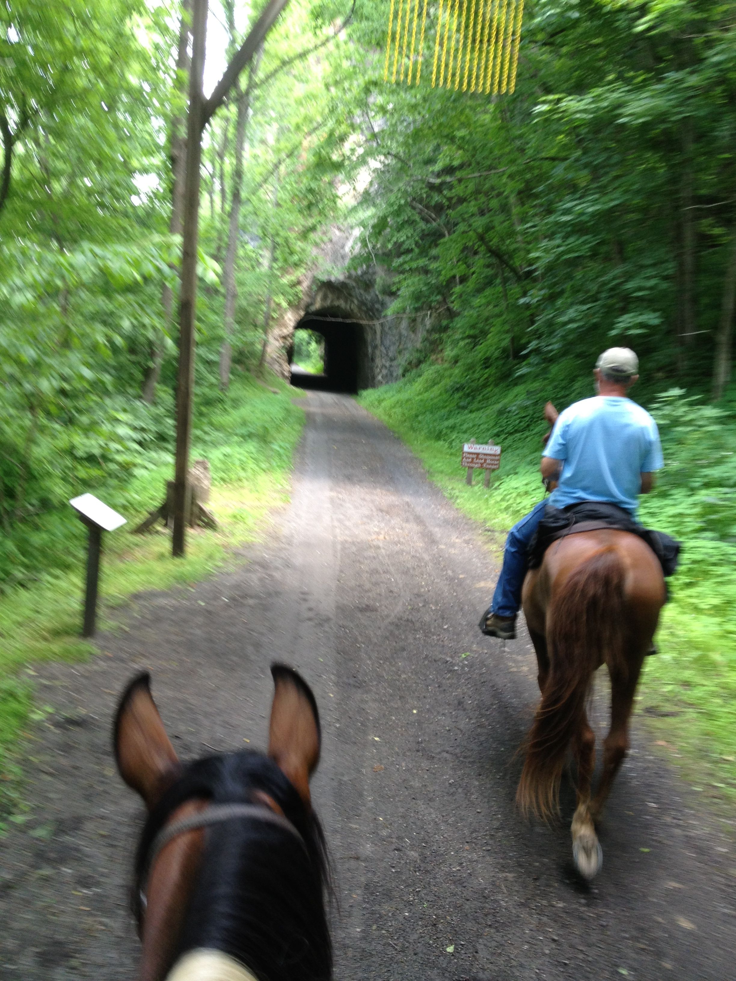 Since I can’t take Tommy off leash riding I took him for a long walk this morning. He was very good. We are getting the hang of everything so clearly now with the electronic collar. On the way back I ran into Penny who finally got out for a ride on her 26 year old gaited horse. Then I saw Key & Chris who came back to camp while I tacked up Wildflower. We went the other way on the river trail, north I think. We crossed the New River over a long tressle and later went thru a tunnel blasted thru the rock. Wildflower was good on both. At our break I hobbled her and when we went to ride again I mounted her and forgot to take them off. I was about to get mad at her until Key pointed out my mistake. Bad mom again…We all talked the entire ride, it was very relaxing, they are such a nice couple.