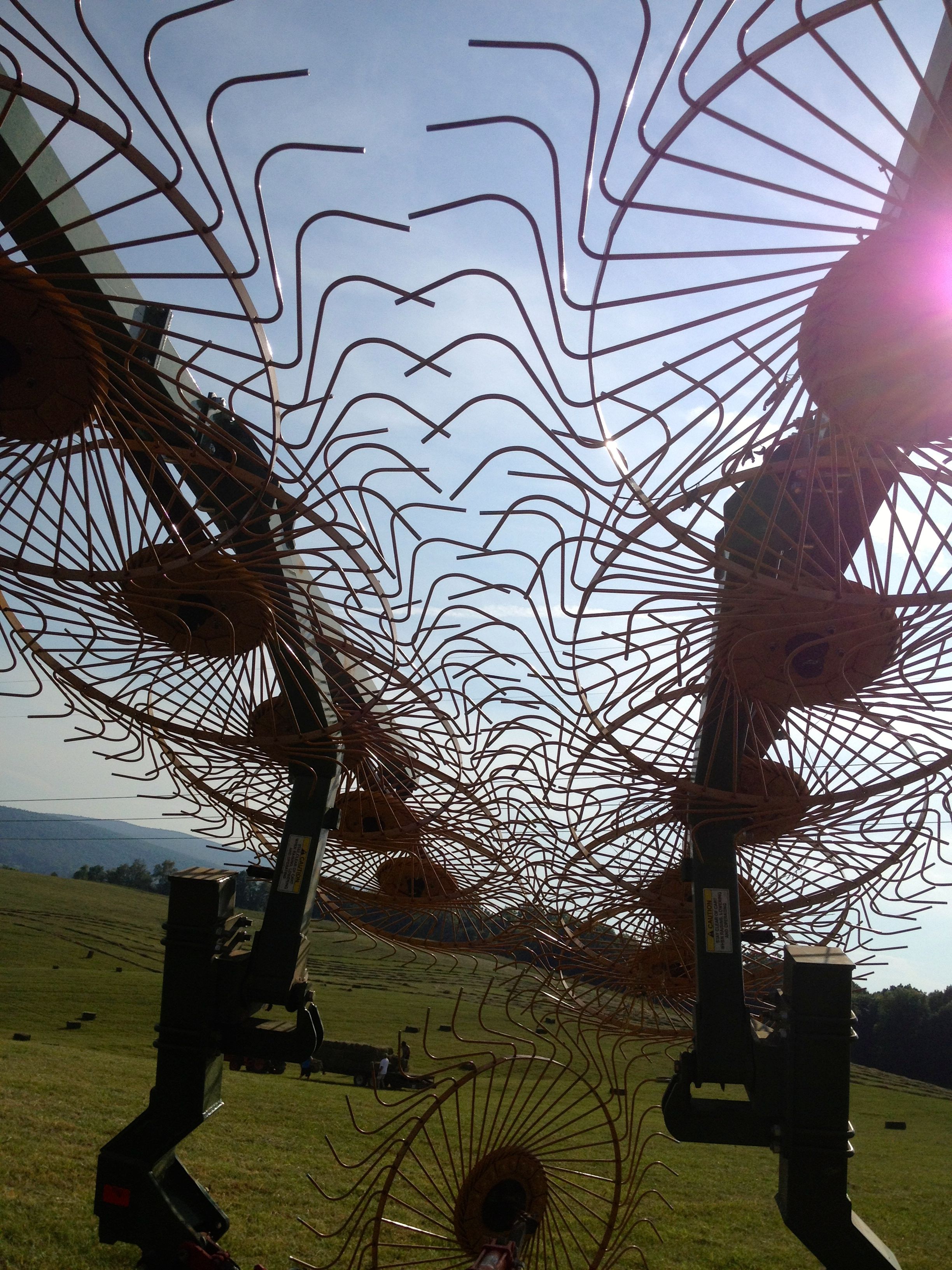 I moved slow all day and I am wiped out now at 8PM. I ponied Wildflower and went out with Key and Chris on the New River Trail. Most of it was on an old railroad line, so it was straightish and flat with crushed cinder footing. There were several tressles to cross over. On the way back we went on the upper trail which was rockier and I couldn’t tell if they were sore or being difficult today, so when we got back on the cinder we trotted, no one was sore there at least, then we did a long canter, still no issues. Sometimes they quarrel with each other and me about where to walk, of course they want to grocery shop all the time too. And its hard to tell if there is a physical problem or if it is an emotional one. Back at camp I let them loose to graze, but hobbled WF. Key did the same with their 3 horses. We are the only campers here. Around 5 I put them back in their paddock and went over to watch the baling and putting up of a 20 acre field of hay that Ron & Penny were helping with. It is their neighbor’s field and they got most of the hay in return for caring for their cows when the owners are on the road (they are truckers so they are gone a lot). I found the machinery fascinating, the small bale baler, the round baler, the rake thing, and all the helpers that showed up to walk the field along side a big flat bed trailer, loading the bales onto it. The round baler was working while this was going on. That hay has more weeds and they use the round bales for the cows. Cows will eat anything apparently. Then they brought the bales to Ron & Penny’s barn and stacked it up to the roof for next winter. They did this several times back to the field, stack it on the trailer, back to the barn, stack it there. They will get one more cutting out of the field so I guess 500 bales will get their 8 horses thru the winter. Its amazing how much work and sweat goes into feeding horses hay.