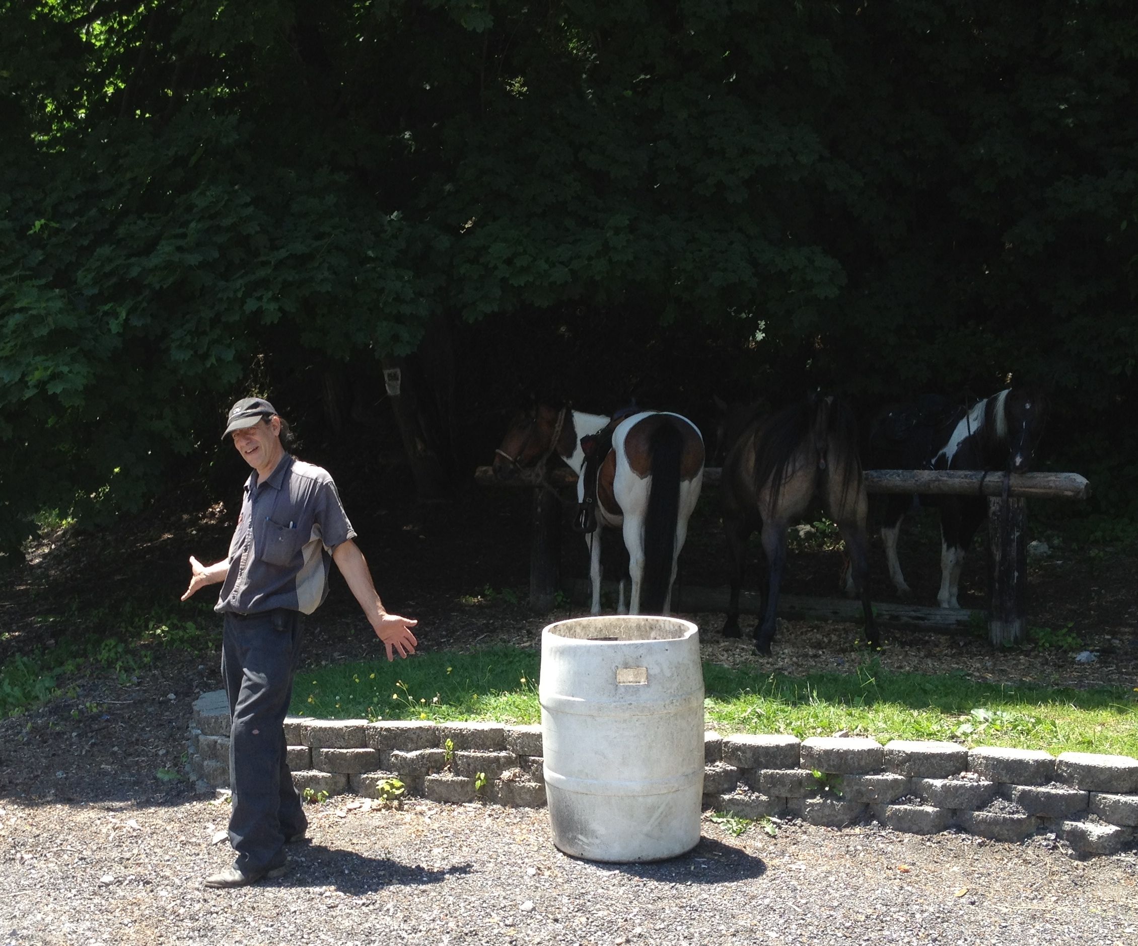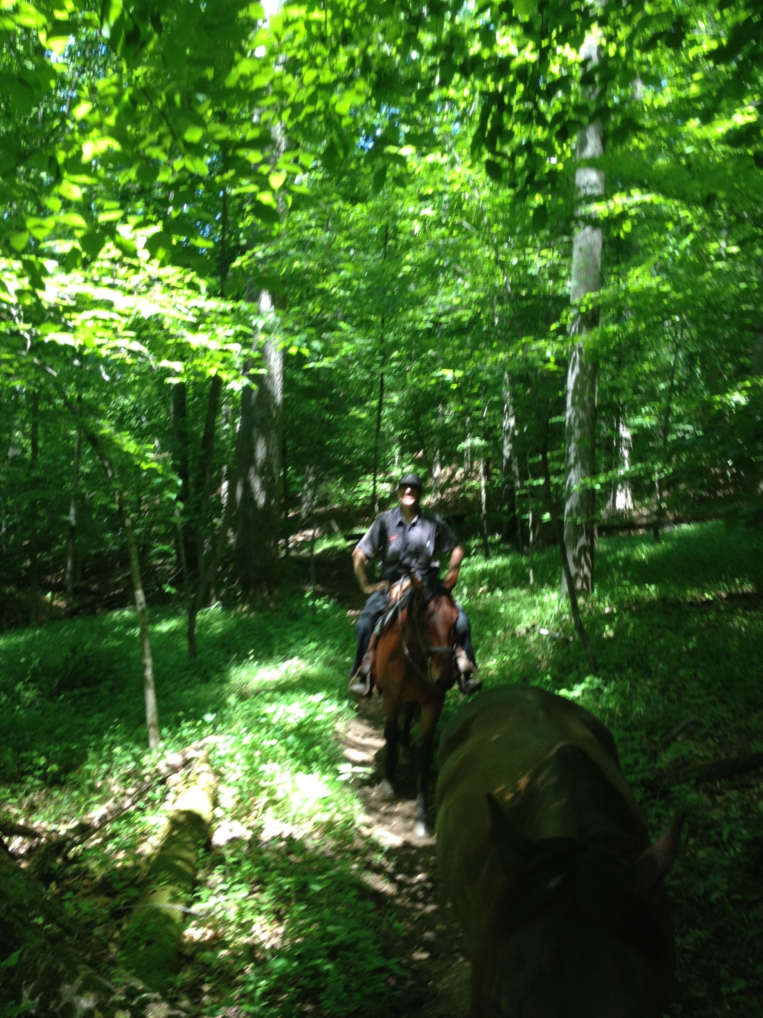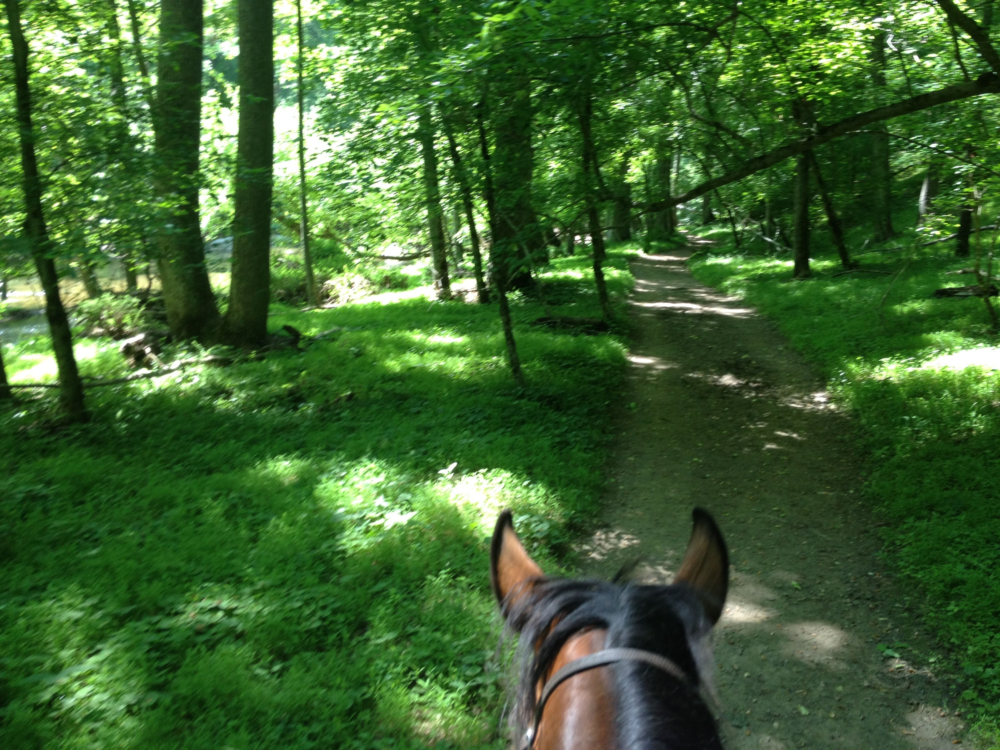 I rode yesterday with Howard and Billy to the Woodstock Inn, which is a bar/restaurant on the train tracks in the rural town of Woodstock. I think it is the only business in town. It is on the edge of the park which is a lot bigger than I thought. The ride there was beautiful, the woods are tall and deep and the floor is green with vegetation. We crossed the river a couple of times each way and it wasn’t too swift or deep really. Rocky bottom. I lost Dreamy’s rope (I was ponying her) at the first crossing but she came along just fine. Howard is a snowbird from Florida and leases a pretty paint from Judy here. When in FL I think he rides paso finos on a ranch. I didn’t much else out of him. Billy is a real character, it took me some time to figure out that everything he said was a joke of some kind. He told me we took a wrong turn and were lost, stuff like that. They knew the trail which was great because I wouldn’t of been able to figure it out, too many turns and unmarked trails. We tied up at the hitching posts and went in for a beer (Howard had lemonade). I could see the horses from the bar. The train came by and I could see WF dancing around. She was tied with my horse hair rope on her bosal and I said if you break another rope of mine I’m gonna be really pissed. But she didn’t. The train was moving slowly, probably about 50’ from them, and she settled down eventually on her own. On our way home we crossed the tracks and headed down to the trail and another train came by. This engineer obviously loved blowing his whistle, it must of gone off 30 times and was traveling the same direction as us basically. WF and Dreamy too, thought it was following us and got their knickers in a bunch (as Marci would say). The ride back was not particularly relaxing for me, especially when the lead horse galloped off. There’s no way I was going to let her run the way she was acting, we did a collected trot (with a few spins to shut her down) the whole way back. That’s it, I am getting a shank bit for her, and probably not ponying off her any more. She requires my full attention and both hands.