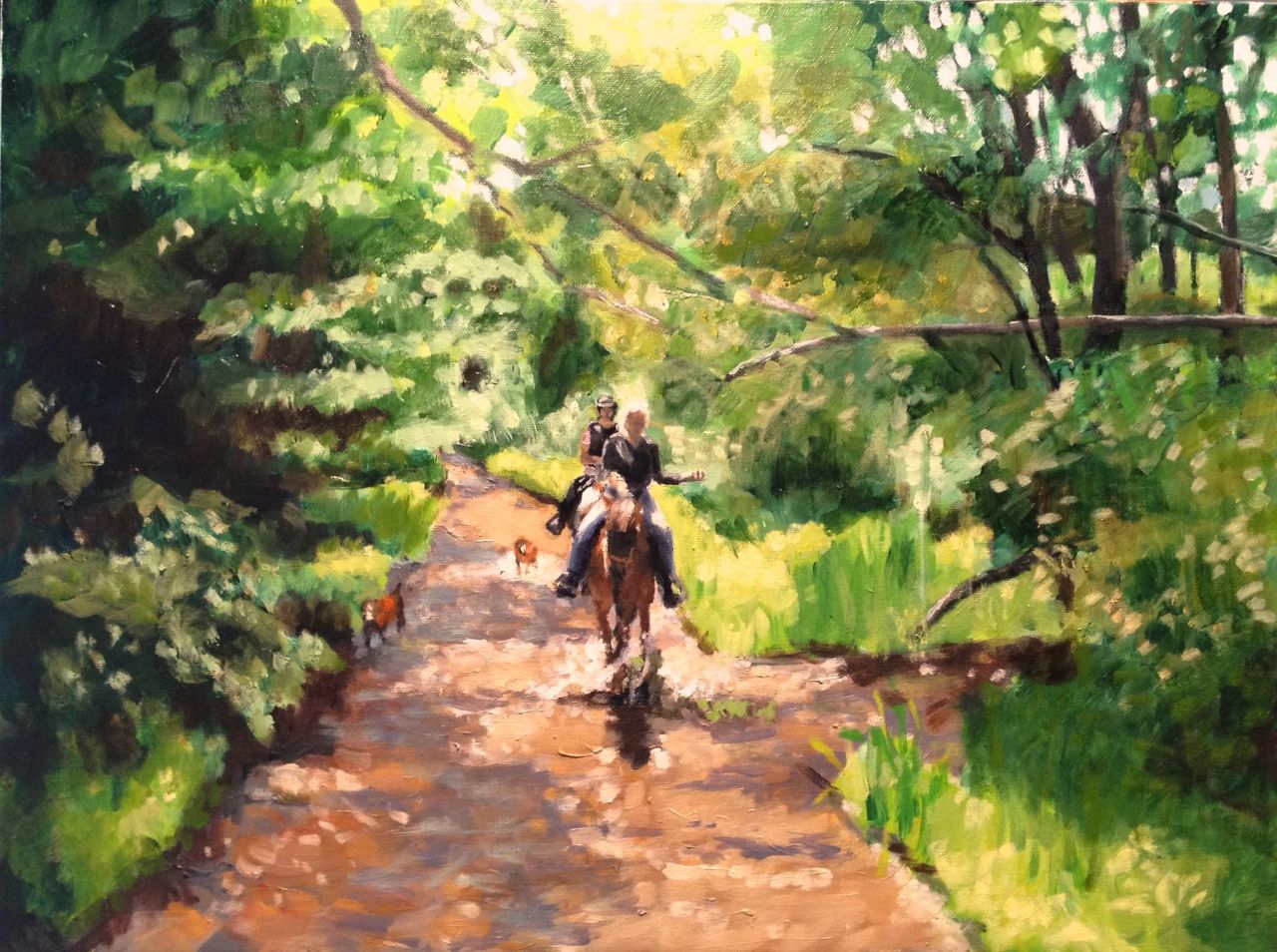 Kate drove me to some local trail heads, there is no riding out off the farm. We walked our dogs together on one of them. Other than an occasional haul with her to Ed’s (her trainer’s farm who has trails there) I will probably not ride here. She offered up her 2 horse for me to use, but I think I will just let them rest in the pasture while I am here. I have a lot to deal with any way and it just seems like too much trouble.