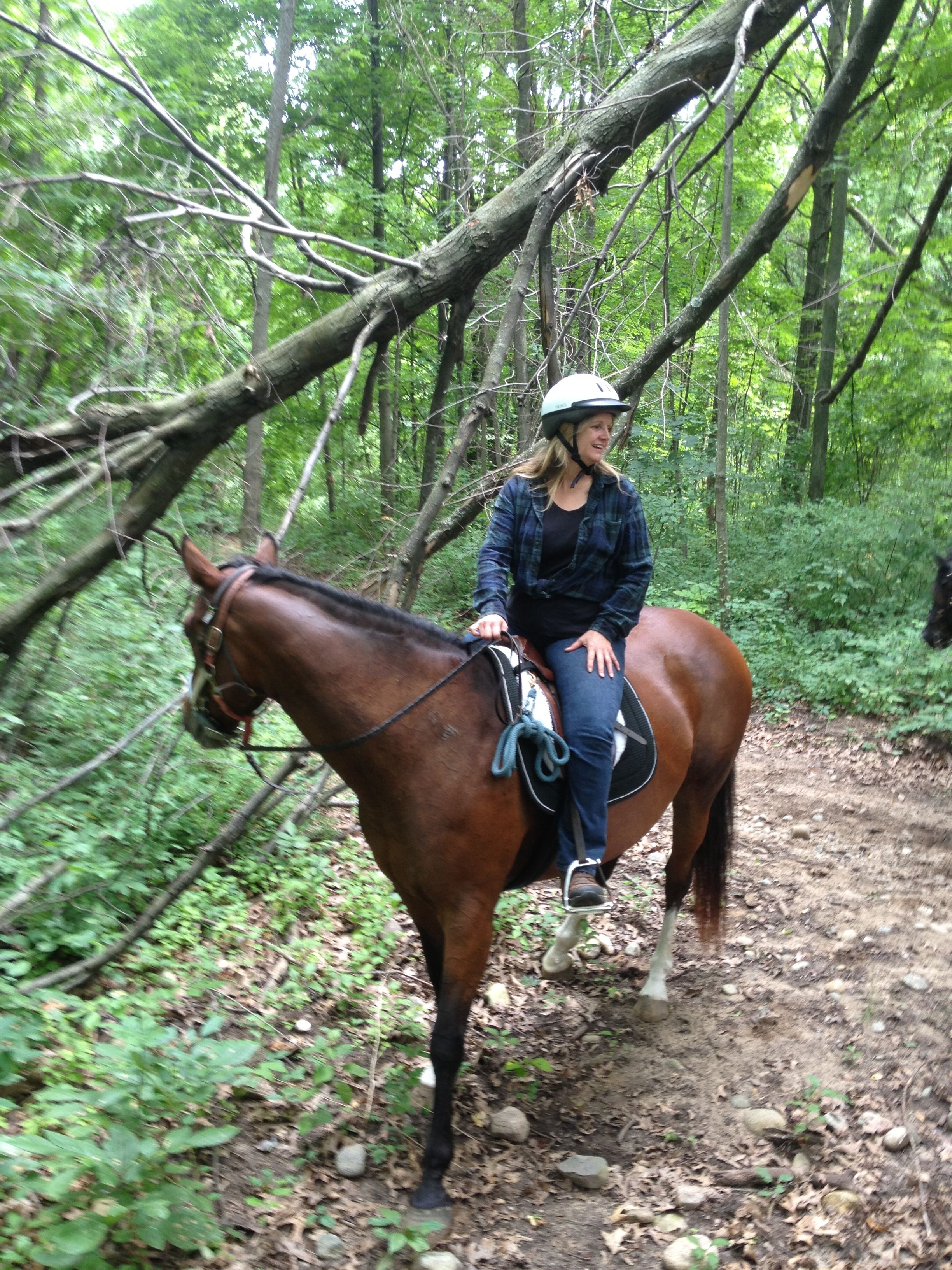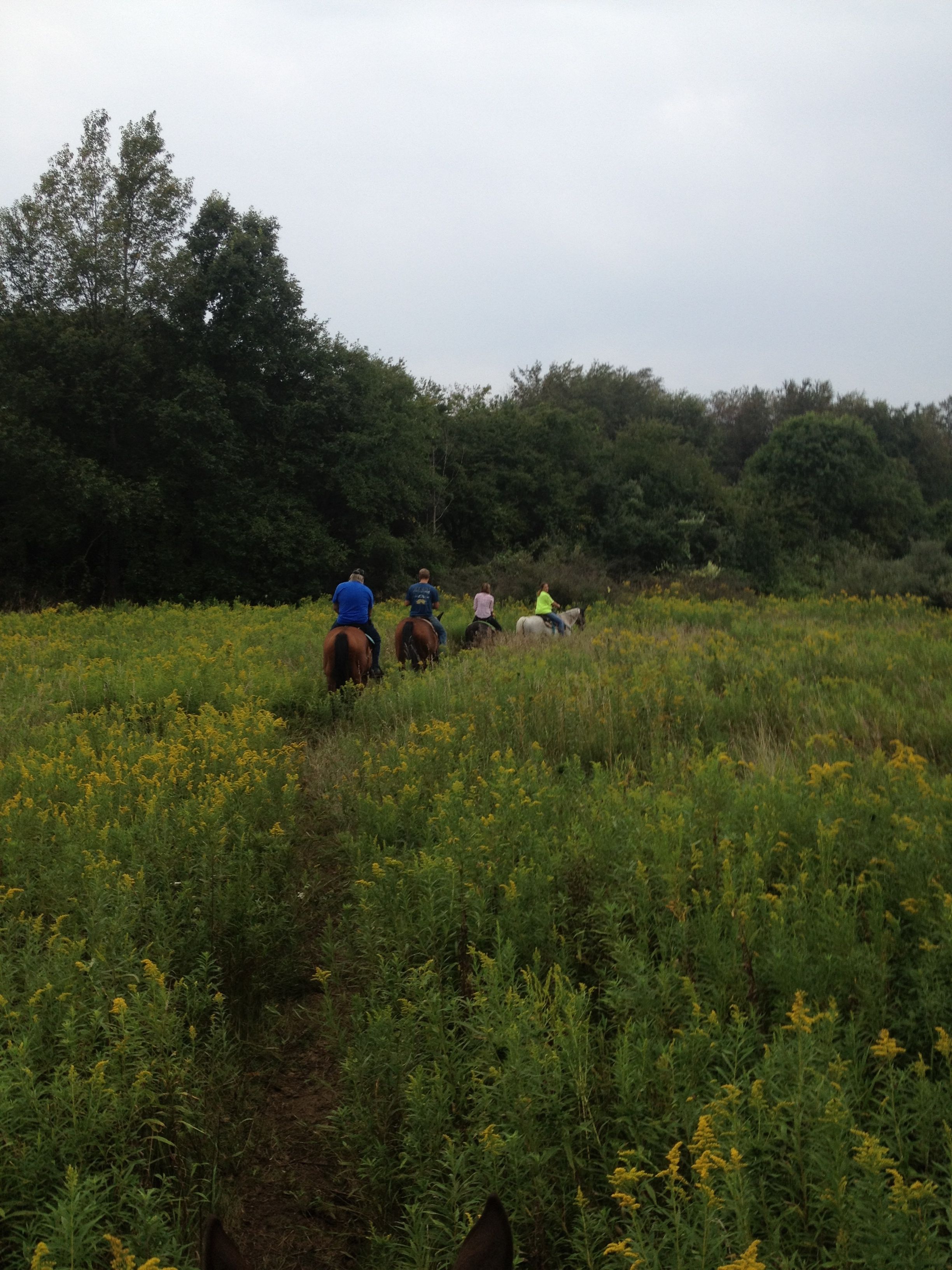 This morning I rode with a trail ride group at 8:30 on Dreamy. I think it was about an hour and a half long, walk only. There was a nice young newly wed couple, the guide, Pam and another regular here on his own horse. It went thru some meadows and into the woods, the footing here is fantastic, sand/dirt, not hard packed and not real deep and soft either. Of course its not all like that but most of it is. There are a ton of people on the trails on horses yet the trails are in great shape. Dreamy was dreamy. While we were out I guess one of the other horses broke into Wildflower’s area and there was some ruckus going on. No one got kicked I was told, hmmm, that surprises me. Wildflower is a kicker.