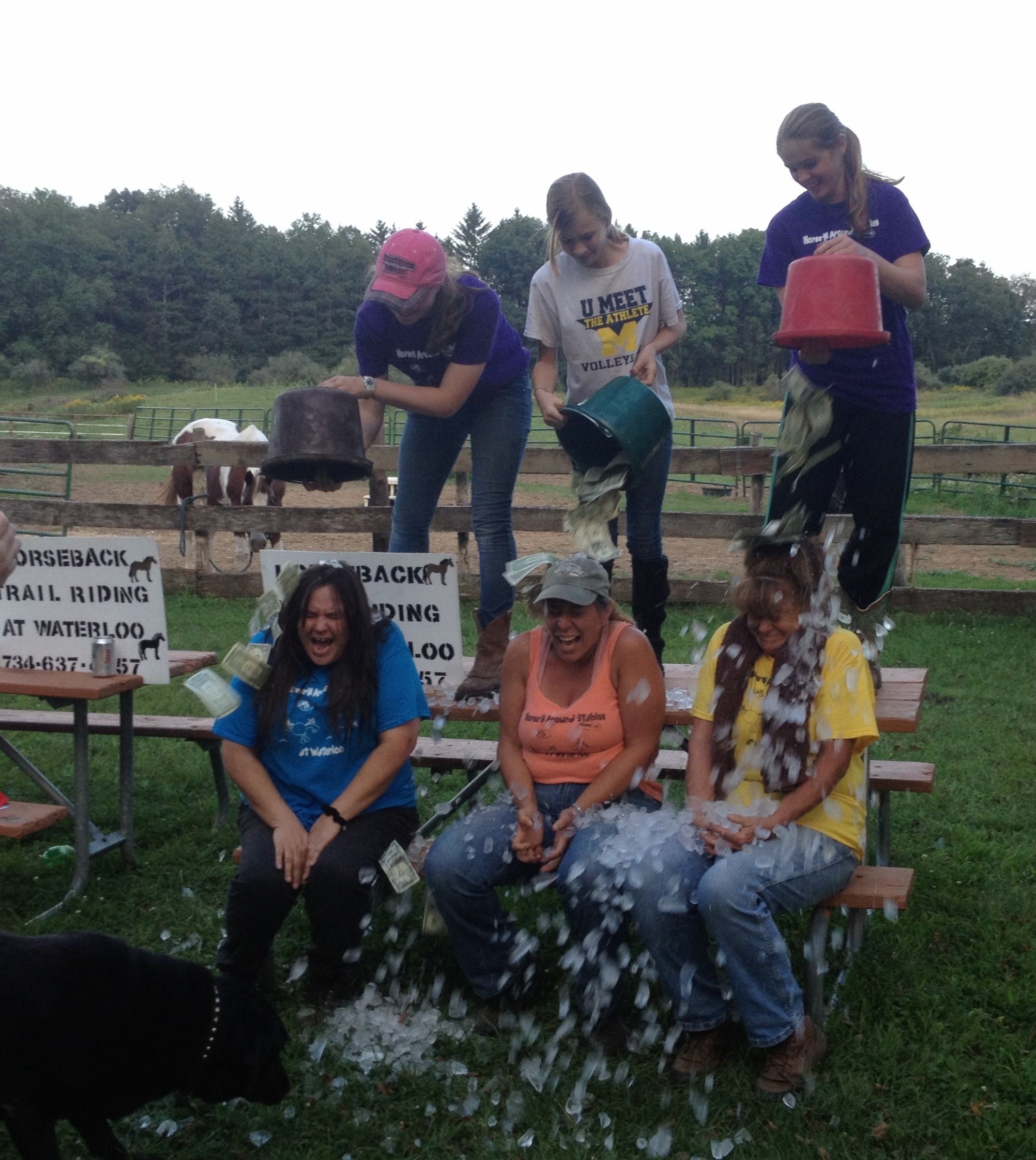 I watched as all 30 some horses were fed grain and then let out to pasture with hay piles. The ice bucket challenge was next, and of course they nominated others and the ice was all scooped up and it was done 2 more times to others. Sherrie was iced twice. I don’t understand how ALS benefits from this fad but I was told that their donations have increased dramatically, maybe just thru awareness?? Luckily no one nominated me. Tommy kept stealing the ice cubes off the ground, he loves ice. Then we all ate dinner together. There was a big assortment of food laid out in the kitchen in the old barn.