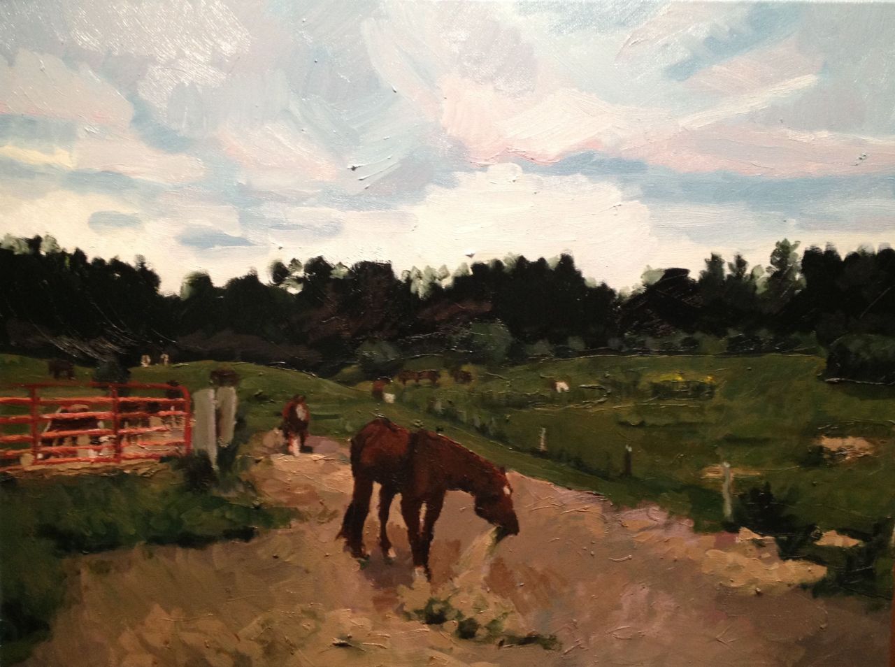 I started the PA painting. I turned on the generator long enough to print out a photo to use. I’m not supposed to turn it on at all here. I picked a difficult shot to use. I’ll have to work on it again tomorrow. There is a lot going on in the picture, several horses, stalls, lots of light filtering thru the tree tops…too much probably for such a small canvas.