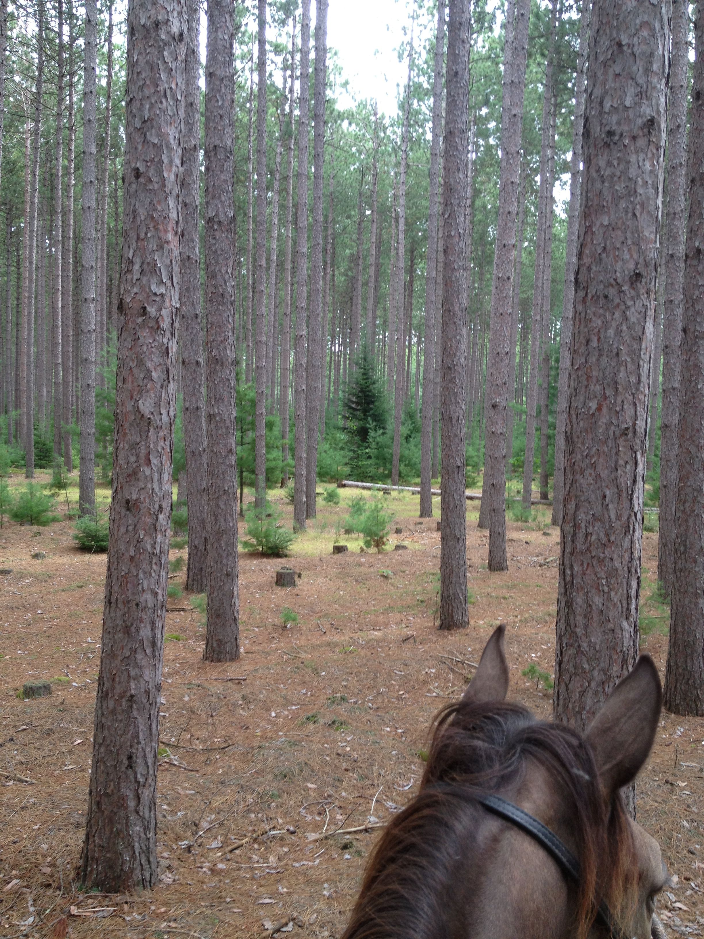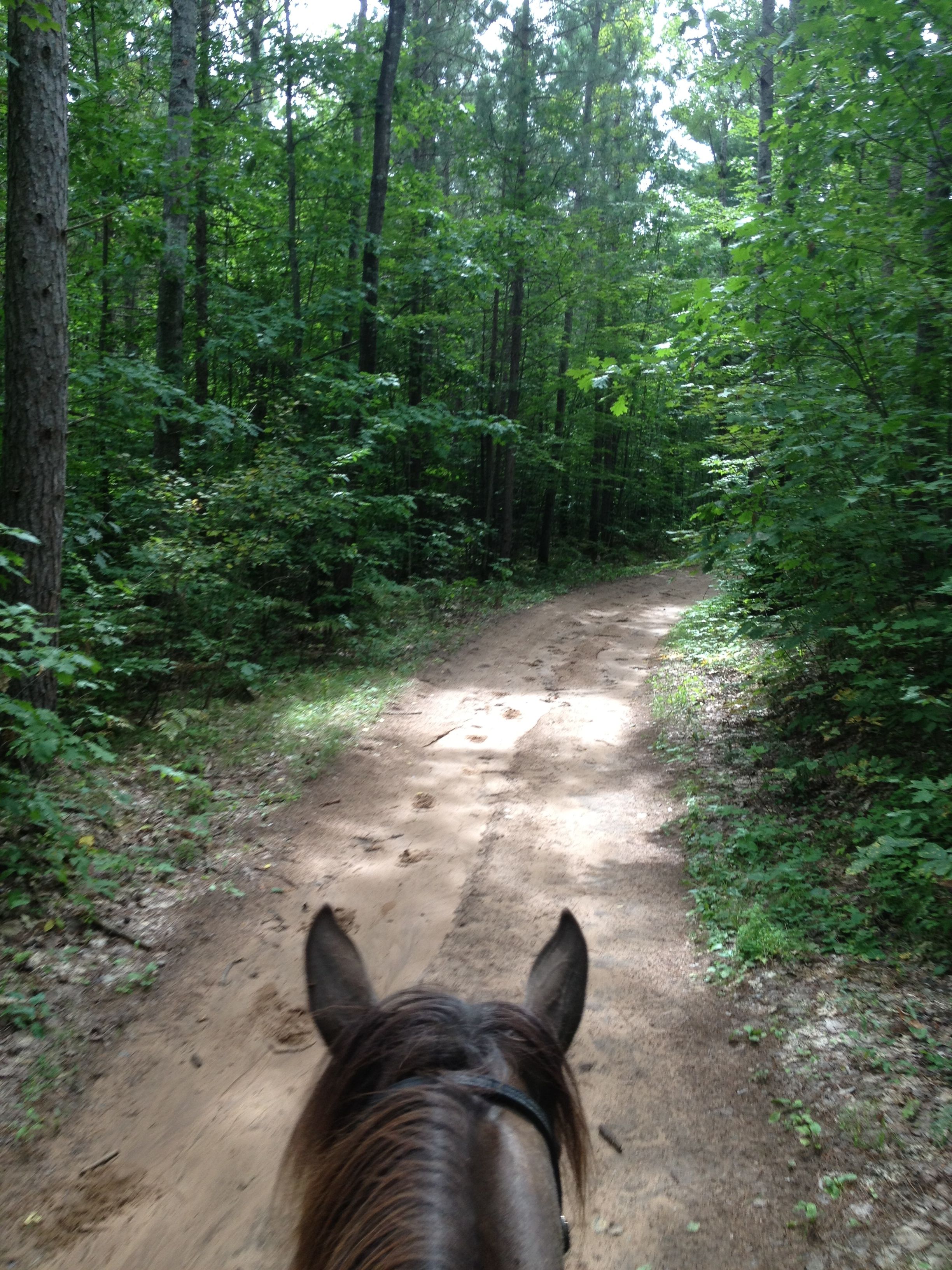 I read more of the book Divergent while it actually hailed and thundered. Its way too warm to hail, but it is! When it stopped I trimmed WF’s feet & booted all 4 (I used the hoof stand and she was much better, actually perfect this time) and saddled her and had a FANTASTIC 2 hour trot and lope with her, mostly on the rail bed trail, some on another trail but she kept slipping so much that I cut that loop short and went back to the rail bed one. She is super sure footed so it must be very slippery. The rail bed is firmer and small gravel stones, perfect for this rainy weather. We headed towards the ice cream store (I got new directions) and on the way encountered a “terrifying” long bridge. Hmmmm…she crossed much scarier bridges like the high long rail tressle in VA, not sure what the problem was. It was cement and had big puddles on it, a short side rail and crossed a pretty wide stream. I backed her part of the way then chose to get off and lead her. When her knickers are in a bunch (Marci’s words) its best to quit or get off I have found. At the other side an atv was approaching with its headlights on. They stopped and a little girl inside with her baby doll fed her a carrot. This is the best way for WF to get over a scary thing, it feeds you a carrot so it can’t be all bad. We continued to the ice cream store but only found a hardware store. Right there at the road was a stocked fishing pond with a big wood bridge over it and 2 horse statues pulling a cart of timber. WF was a bit put off at first till she spotted the 2 deer behind her. She is so funny. Last week I thought gee, she seems out of shape. Well I was wrong, she is the energizer bunny again. On the way back to camp a storm was brewing and she kept wanting to turn around and go the other way, away from home! It was getting dark and thundering pretty loud. It started pouring just as we got back. I quickly got her untacked and while putting away her saddle, she found the new hay under the tarp. Well, I guess she likes it. That’s a good thing, the last batch was full of weeds.