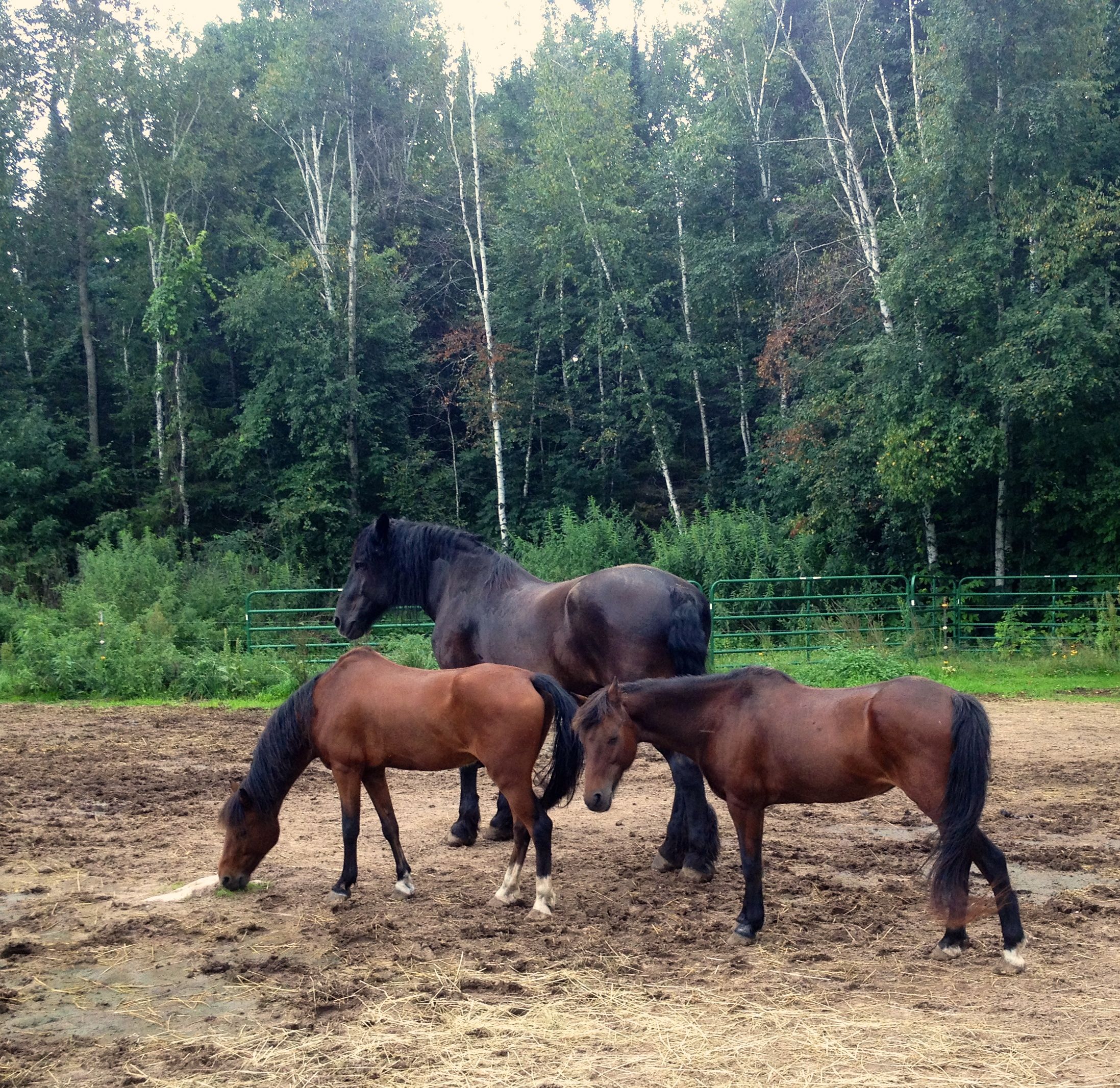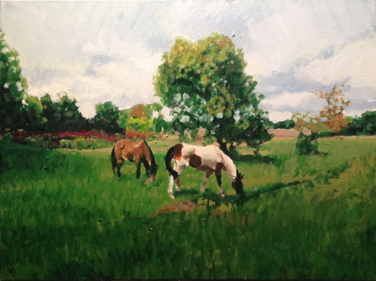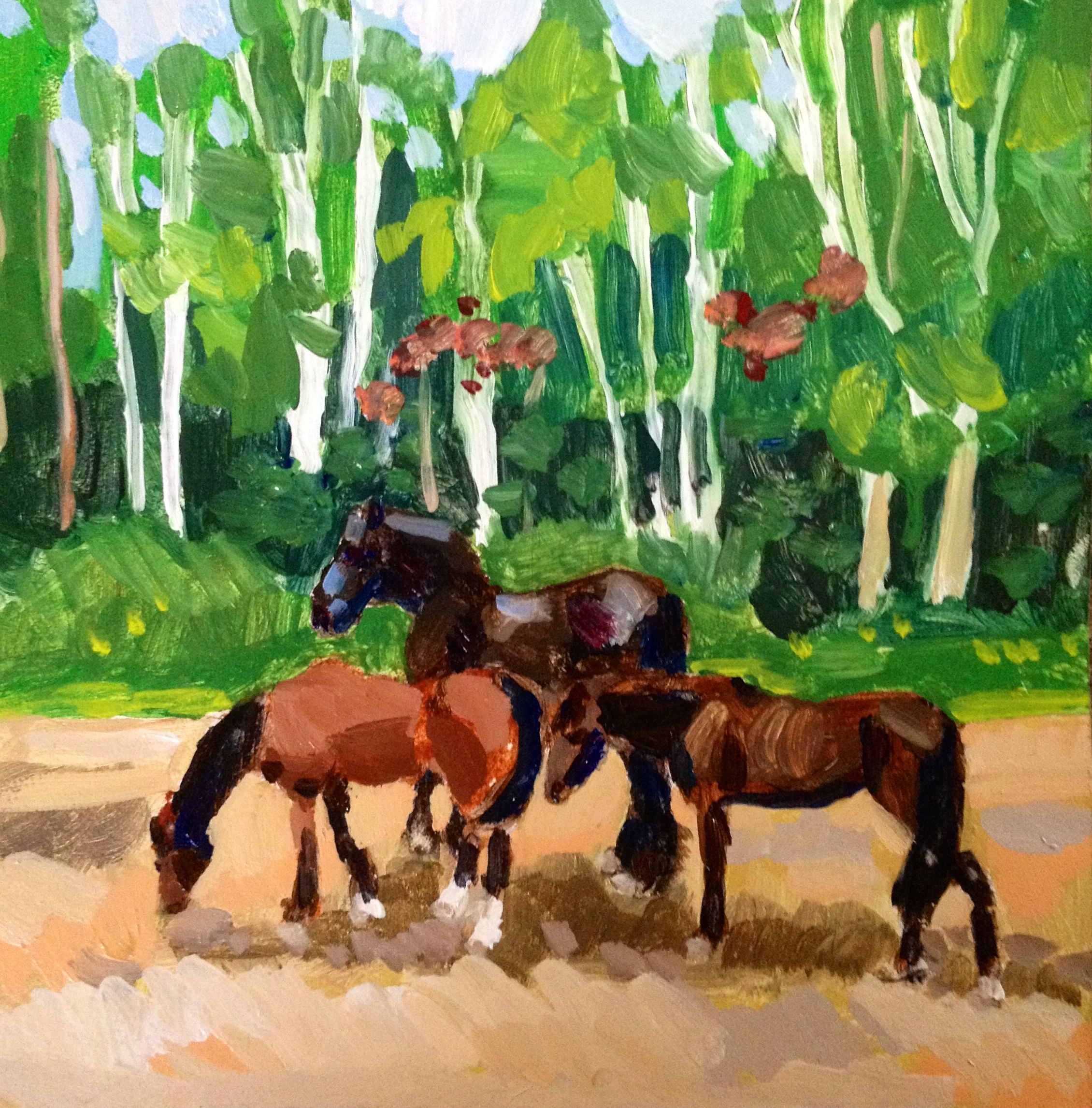 It thunder/lightening/poured most of the night. I fed and cleaned out the corrals early, let the horses graze in camp since their hay looked like solid weeds, and it looked like it was going to be a nice clear day. I got 7 bales of hay delivered by the owners who told me another storm was coming. So I covered all the hay and finished the Wisconsin painting in the trailer. Its a shot of the owner’s 2 little horses (I forget the breed) and their percheron. I like it.