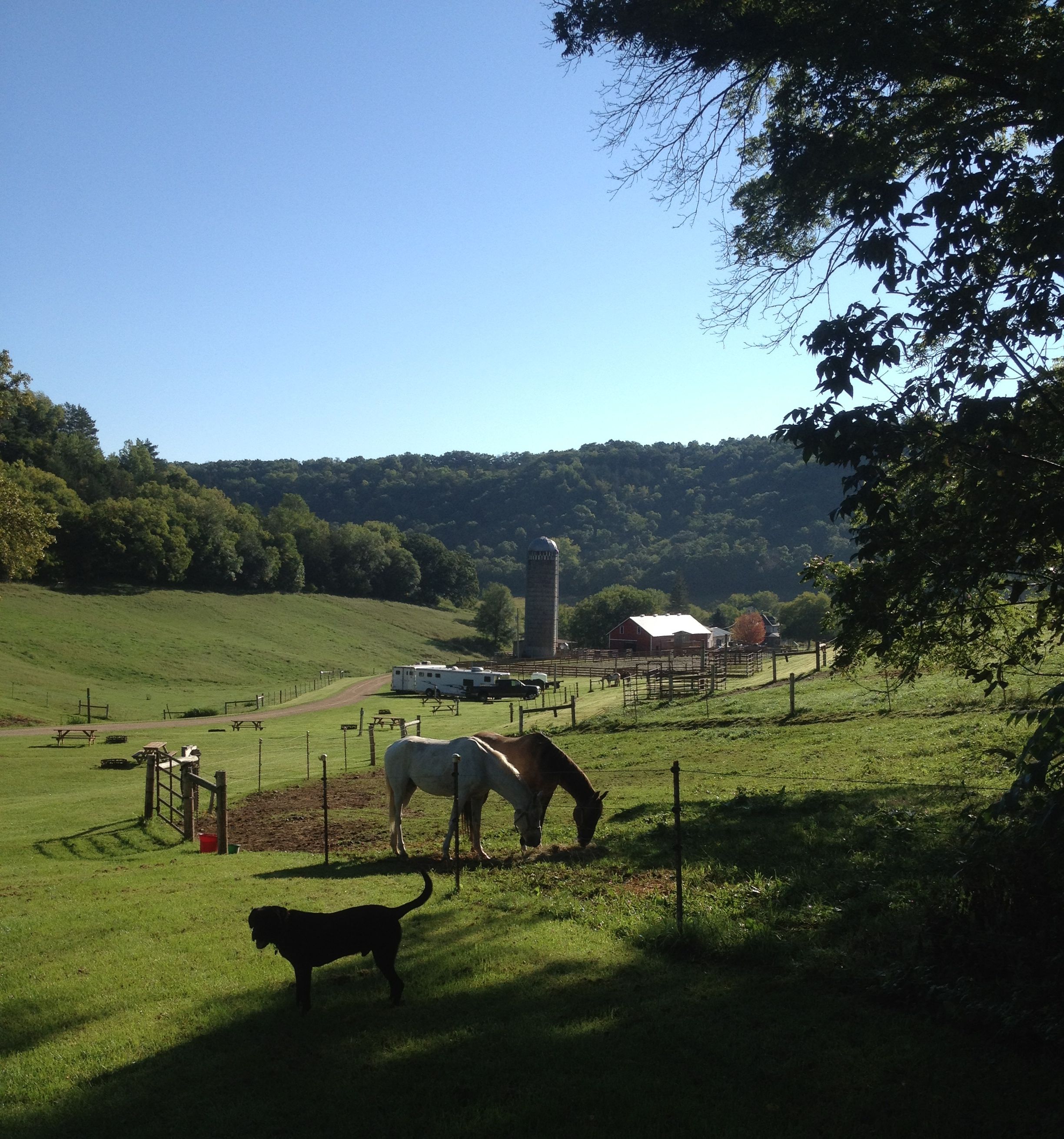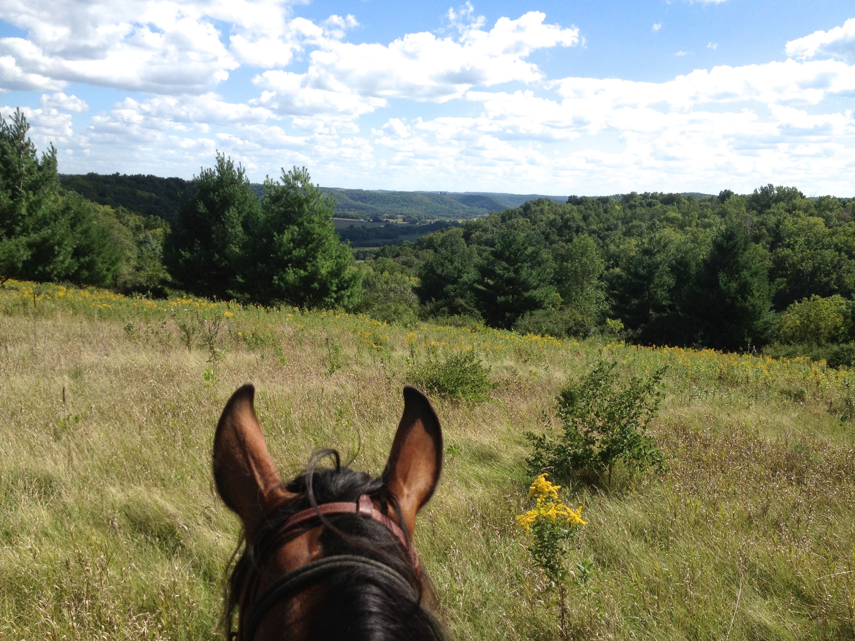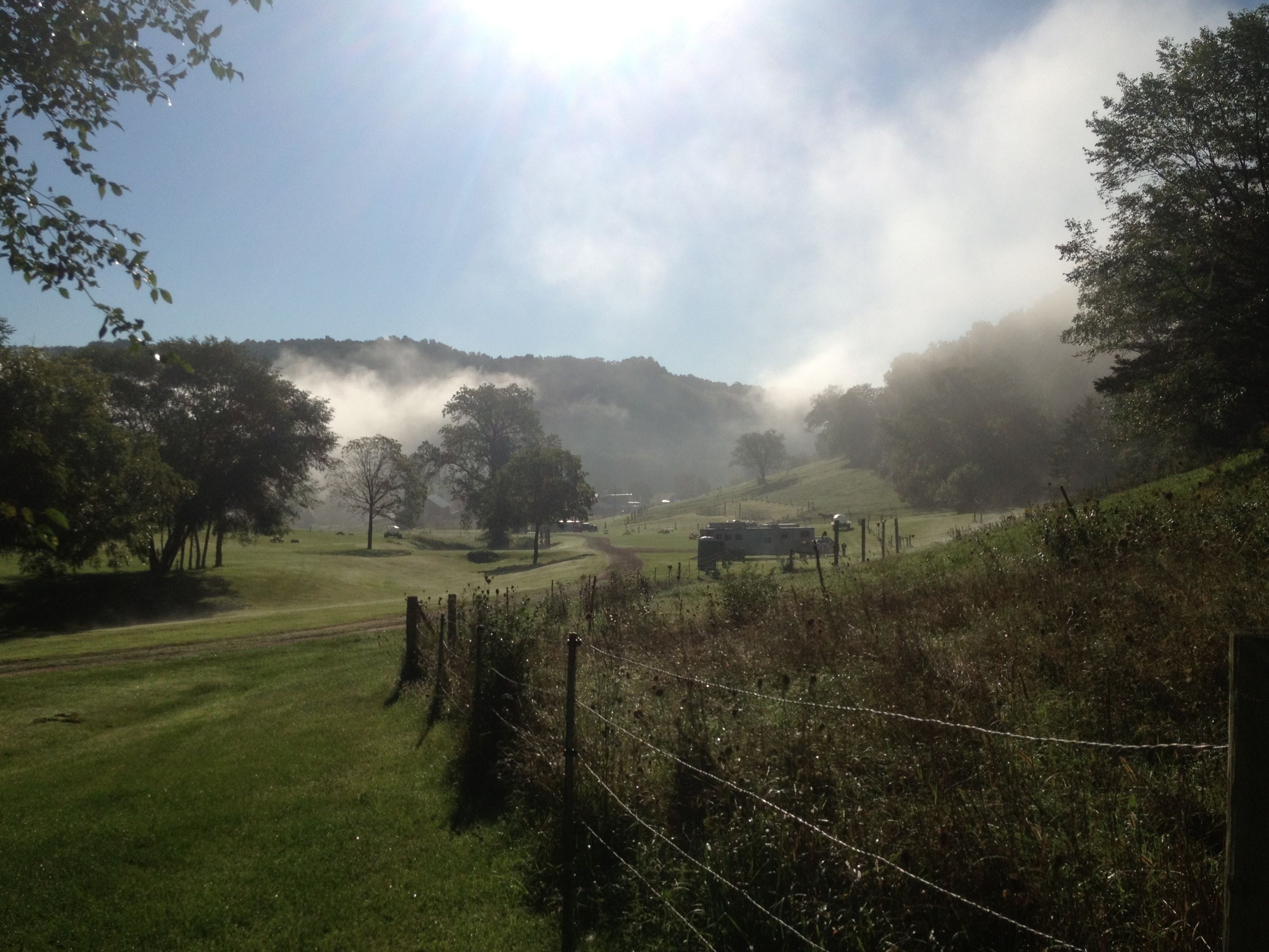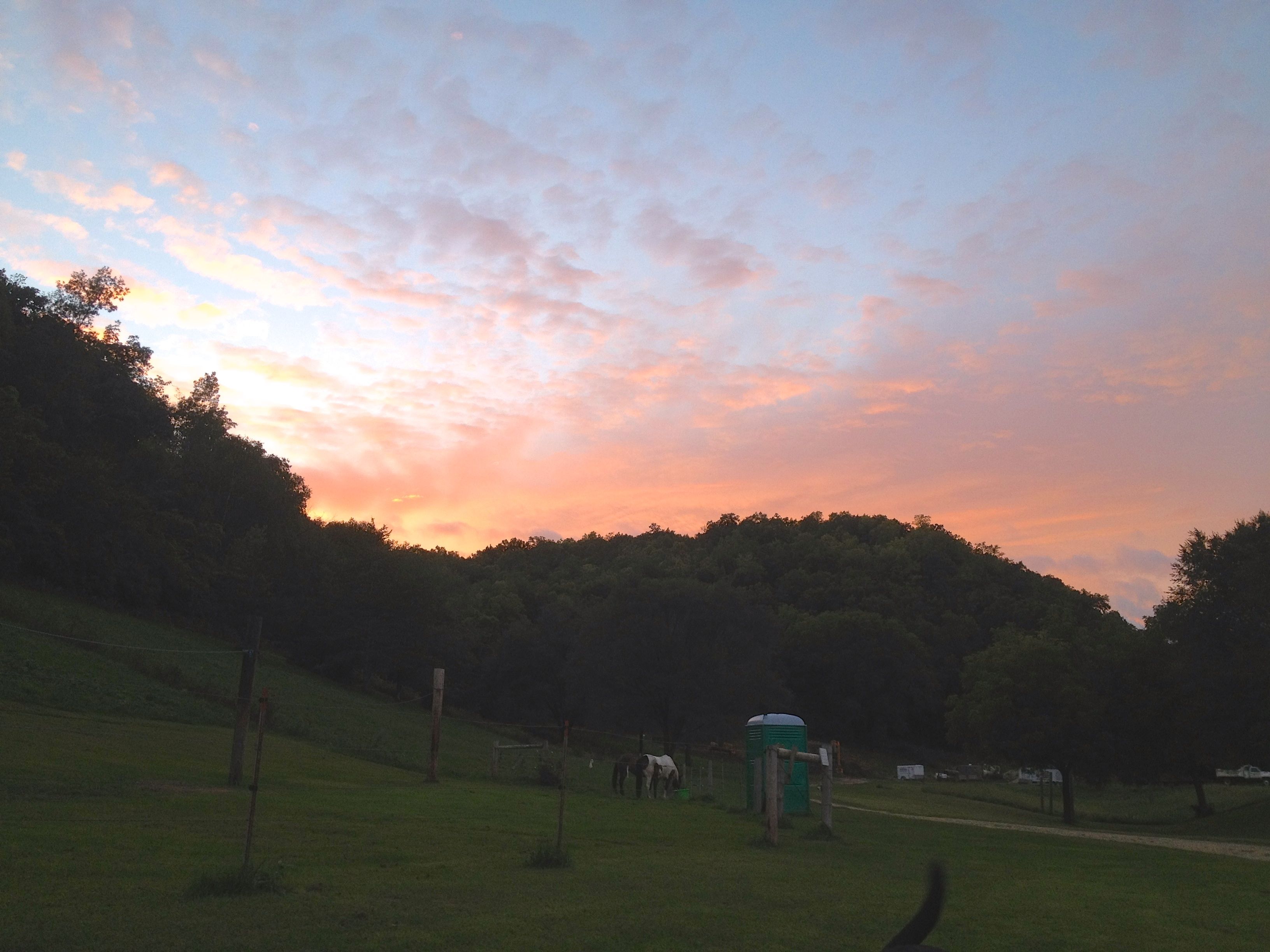 9/7/14 Outback Ranch, Houston, MN; state #39 (one of the nicest, and popular to locals campgrounds ever) I talked with the couple in the enormous/fancy rv before I pulled out of WI camp. He pulls a long trailer with it loaded with his truck, 2 atvs and 2 kayaks. This guy can drive! He is in the business of building scientific labs. They were really nice and asked for my blog address. In response to my answer of why I had taken on this trip he said “its amazing how little time it takes a schmuck to do a lot of damage”…well put I thought. (I am posting 2 pictures from my ride on WF my last day in WI now too, on the scary bridge and with the 2 horse statues and logging wagon. I must of missed them on my last post.) I had a big mess in the corrals to clean out, tons of wet hay. I let them graze a while till they wandered too far. I went up to the owner’s house to use her wi-fi to publish a post for WI (but I’m not sure if it actually did it or not), dumped the tanks and pulled out by 10:30. On the way to Minnesota I stopped at Walmart and stocked up on groceries. I got into camp around 4 or 5. The route was half interstate and the rest was beautiful state highways which Wisconsin keeps in great repair. I crossed into Minnesota and my exit ramp was closed, ugh…it re routed me nicely tho. I opted out of the “sharp turn” directions off the camp’s website directions and had no trouble on the “cut across road” which was dirt. There was another long dirt road leading to camp and the entire MN area coming in is gorgeous. Hills, farms, and the weather was lovely… Camp is set in a little valley and the side walls of the valley are the grass pastures for the campsites. There are 2 barns, a big dirt arena. There are a lot of sites, some are electric, some not. A few cabins and different areas of camp sites, its a huge ranch and spread out. There was an old black lab wandering around and adorable little boy shuffling around in new cowboy boots that were too big for him (I was told he refuses to take them off). A guy, I think the owner? Jake? and another young boy, helped me fill my water tank since there is not people water at the sites. He crawled under the trailer to see if he could fix my clogged air hose issue. I have to keep pulling the hose out to “burp” the tank. Some time ago I discovered a twig in my air hose. I can’t get it cleared and have just accepted doing this but he said if the twig gets loose in the tank and gets into the water pump it will break it. He said the hose is all under metal and maybe I can access it from inside the trailer. Ugh… The horse water is in big tanks on flatbed trailers stationed around camp. The hose is like a fire hose and when you open the valve it comes out with tremendous force. But it fits nicely over the 5 gallon tank that Jack gave me back in ID and it fills it up in less than a minute. I use the hand truck to get it back and forth to my horses’ pasture. I have been very friendly at this camp, not that I’m not friendly, but it is coming more easily now, like I used to be a long time ago, actually almost “outgoing”. I have met everyone here I think, even the group at the remote cabin when I was out riding Dreamy. Last night, after Liza got here, we joined a campfire of 2 couples that are here together and had invited us to their fire. We had a hoot, I laughed so hard at times my eyes were watering. They had a hollow log that they had been saving and put it in the fire, then fed old christmas lights to it, the copper wire making green and blue flames. It was really cool. And incredibly hot. Liza kept asking if she should move away as if it might explode. I got to sit in one of their super comfy bungey cord lounge chairs. I really wish I had one of these chairs, but I don’t have room for it really. We talked about e cigarettes (and how I had dropped mine in the porta potty here and retrieved it and then angsted about how to sanitize it and my hand), parents dying, diabetes (one of the couples has a 24 year old diabetic son who is a tri-athlete and has gone thru many of the same fears and failures I have), shorts in the trailer (one woman got a super shock from plugging in her blow dryer while soaking wet outside and they had a bad ground in the plug), rowdy campers and rider stories (one woman works for the DNR and related a wild story and how she shut it down with one phone call). Its nice to know that other experienced campers have the same troubles I do and that we can all laugh about it now. It feels so good to laugh. I had a great ride on Dreamy yesterday, into the state park trails. I spent the first half hour feeling grateful and praying. I prayed for God to use me to shine his glory, peace and joy onto others. Especially for my sister who was on her way here. I held my hands to the sky and arched my back and looked up. Dreamy is used to this and she just keeps going. I have gotten so I can do this with my upper body and still guide her with just my seat and legs. Then I thanked her for being such a good girl and letting me pray and we picked up the pace. She was acting like it was too hard for her on the way out, blowing hard at times. Lots of steep hills up and down. I was feeling bad about it and after an hour and a half or so I stopped at a small empty campground to let her rest & graze. There was no water there and I thought she was thirsty. When I got back on her and headed home she took off like a rocket down hill. She got me again! Why do I fall for this. Its not faking lame, its buddy sour super bad. But I didn’t get mad about it, its natural for her to want her herd. Anyway it was a very fun ride back and she showed me again how capable & fit she really is! Natural impulsion is so much fun on her. God I love this mare. The trail map they gave me is very hard to read so I downloaded it off their website and messed with it in photoshop and printed out one I could read. The trails are very well marked w