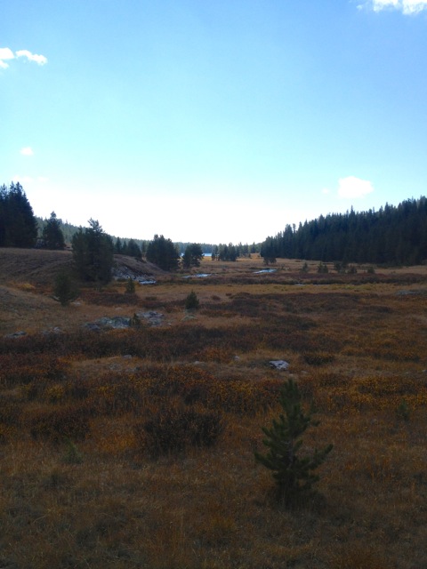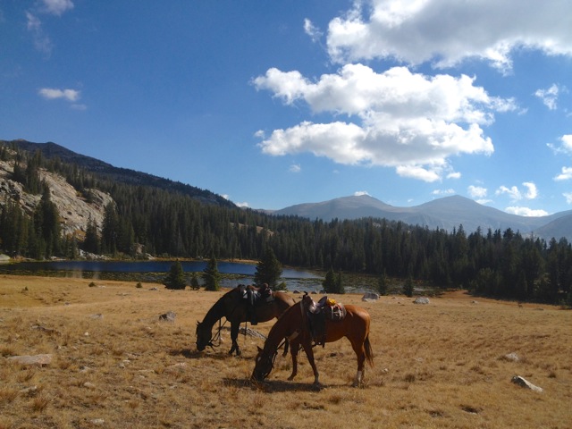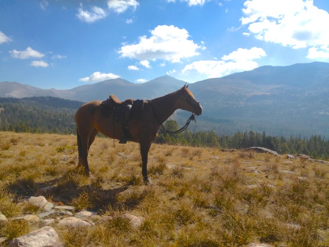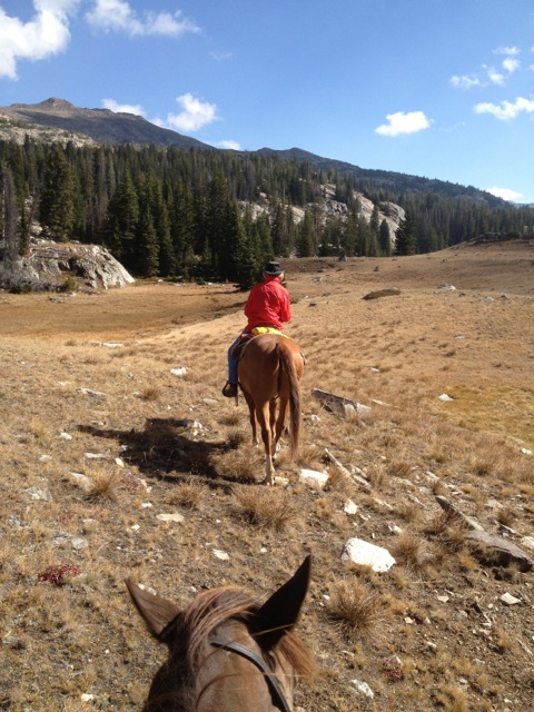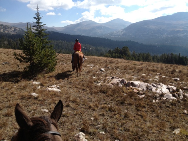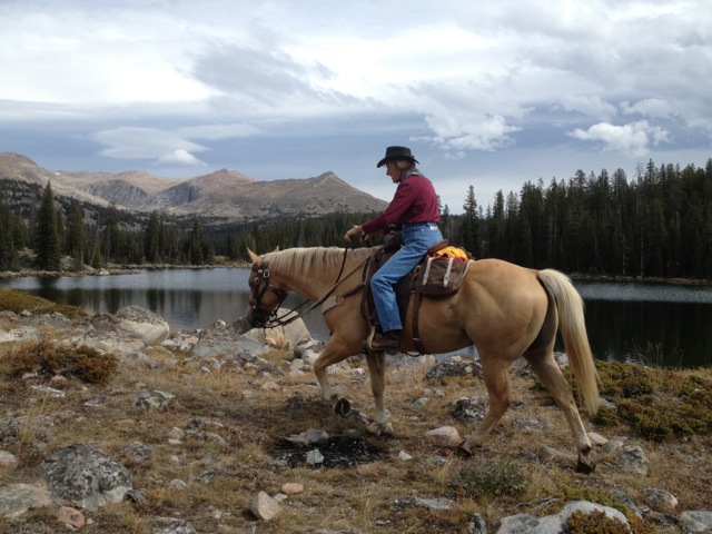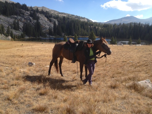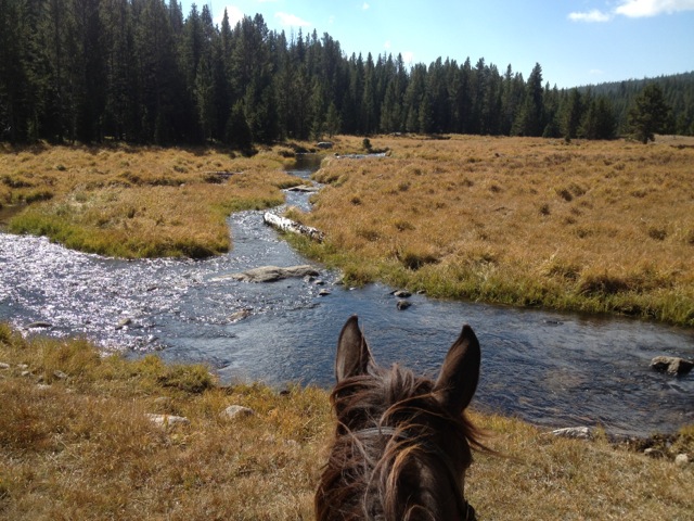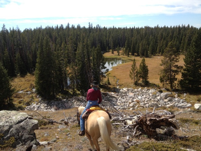 I have a bunch of shots from my ride in another direction. At times we were in the trees, climbing, or picking our way around rocks, thru streams, across meadows, around lakes…it was diverse and breathtakingly beautiful. Dreamy was stupendous. Not one bad step, up over 10,000’ and back down, jumping streams, stepping between big rocks into mud, steep downgrades, everything that used to give her trouble. She had boots on all feet and none of them budged, (she has a perfect shaped hoof now for the easy boot glove). Man, I love this horse! We were out for about 4 hours I think. Extra huge thanks to Bonnie for guiding me while I was here. I would of never found my way around. I would love to live here and get to know the trails like she does. Some folks on FB said its always windy in Wyoming, but its not windy in Ten Sleep at all, it was at the higher elevations but not bad. Others on FB said the winters are severe, but Bonnie says that down here they are not bad at all, and pretty short. Need to investigate this further. Another camper told me he saw an ad for a 3 bedroom on 10 acres here for $300,000. I wouldn’t call that expensive. I don’t know if I’ll be able to afford even that but its possible and gives me hope.