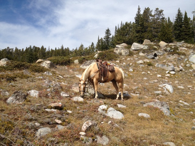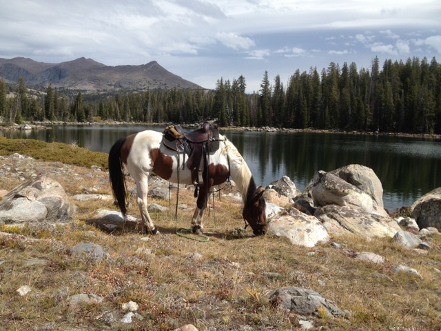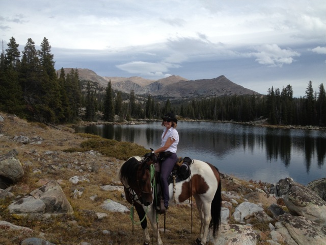 Bonnie came knocking at my door to go ride, so I unhitched the truck and hitched up her stock trailer, booted and saddled Wildflower (as Dreamy pitched a fit about being left behind) and off we went back towards the pass I hauled in thru. We parked near a National Forest Camping site (non-horsey) and we rode up to a pristine lake at 10,000’. Wildflower did great. I hate to recount what she did wrong, she wasn’t perfect but she had no trouble with the rocks, mud or leaving Dreamy so I won’t complain. (But I did spend a couple hours back in camp trying to fix 2 boots that she ripped the gators off of.) We had a nice easy conversation, we were out about 3 hours I think. Bonnie and her husband will be celebrating their 50th wedding anniversary soon. That is something to be proud of. They have 1 great grandchild already too. They have been in Ten Sleep for 20 years now and love it here. I would too. The scenery is not to be believed in that pass. And the town is a super tiny country town. Real estate prices have gone up recently and its hard to find land, most of it is owned by the government. Ranchers lease grazing rights from the feds. They have a short mild winter that is dry and not too much snow. And the riding is spectacular, pine forests, meadows, creeks, lakes, high mountain peaks…there is no way I could of found my way without her, the trail is not always clear. We saw a lot of elk droppings, but no elk.